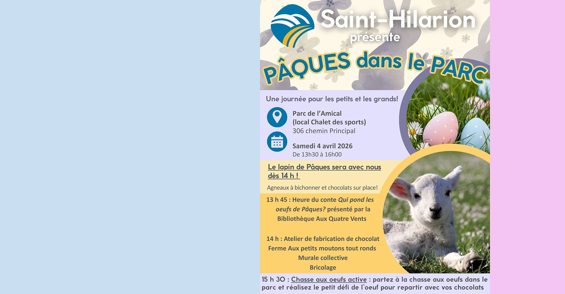 De nouveau cette année, la municipalité de Saint-Hilarion organise une fête de Pâques des plus diversifiées le samedi 4 avril de 13 h 30 à 16 h.