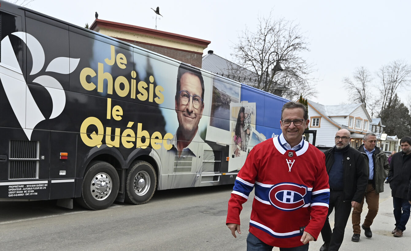 Yves-François Blanchet, le chef du Bloc Québécois, de passage dans Charlevoix. Yves-François Blanchet s’est rendu avec un chandail du Canadien de Montréal au Saint-Pub de la microbrasserie Charlevoix, à Baie-Saint-Paul, pour écouter la partie de hockey des séries de Montréal. Photo: Jean-François Desgagnés/MPC