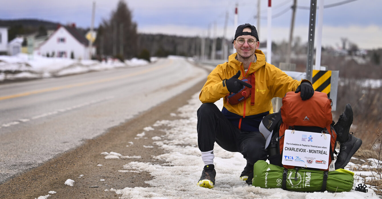 Simon Blondin se dévoue dans une marche de 450 km, de Charlevoix à Montréal, pour la Fondation de l'Hôpital de Montréal pour enfants. Simon Blondin sur la route 362 aux Éboulements. Photo: Jean-François Desgagnés/MPC