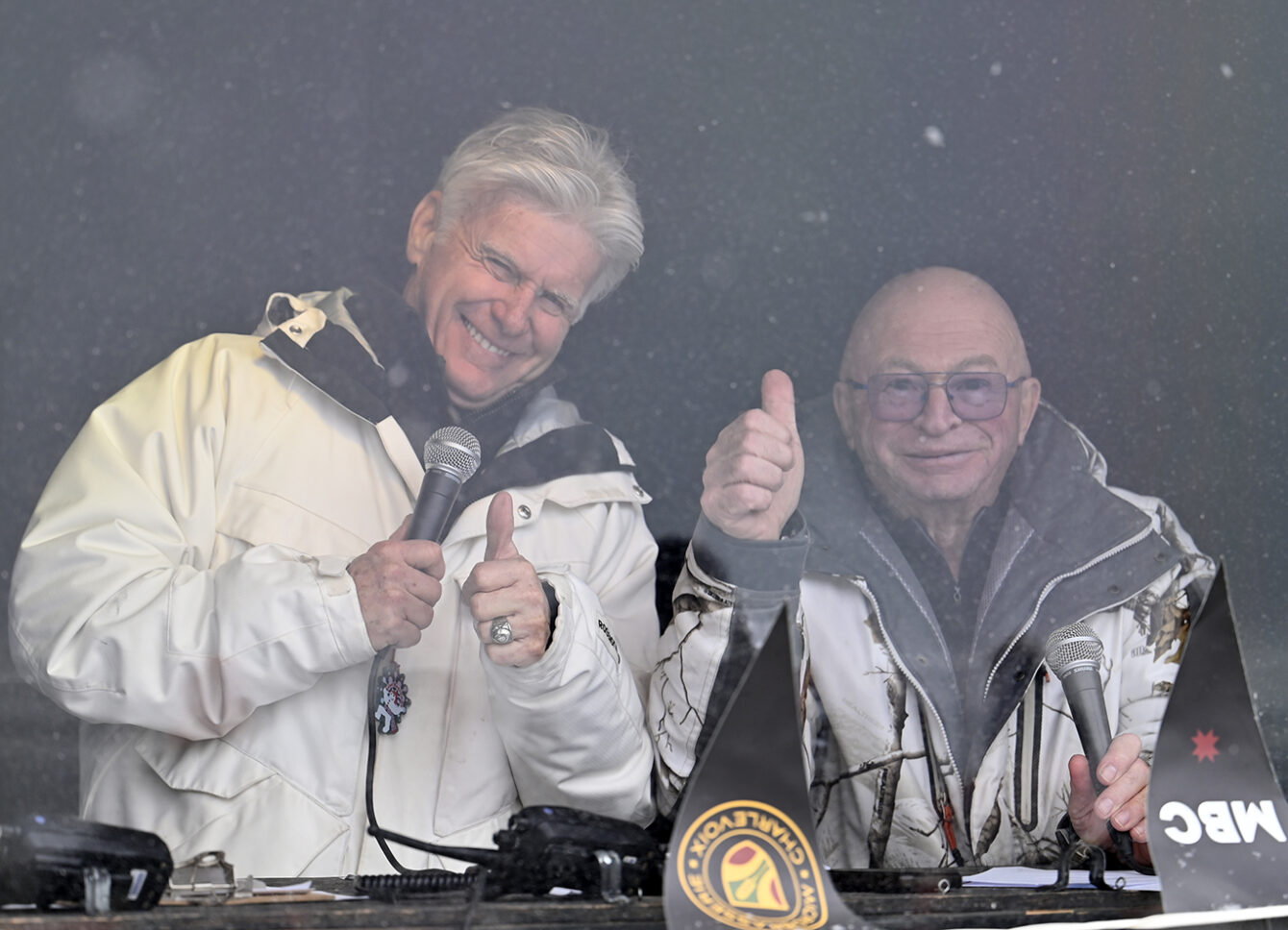 Marcel Bouchard commentait la course. Le voici en compagnie du maire de l'Isle-aux-Coudres, Christyan Dufour. Photo : Jean-François Desgagnés/MPC
