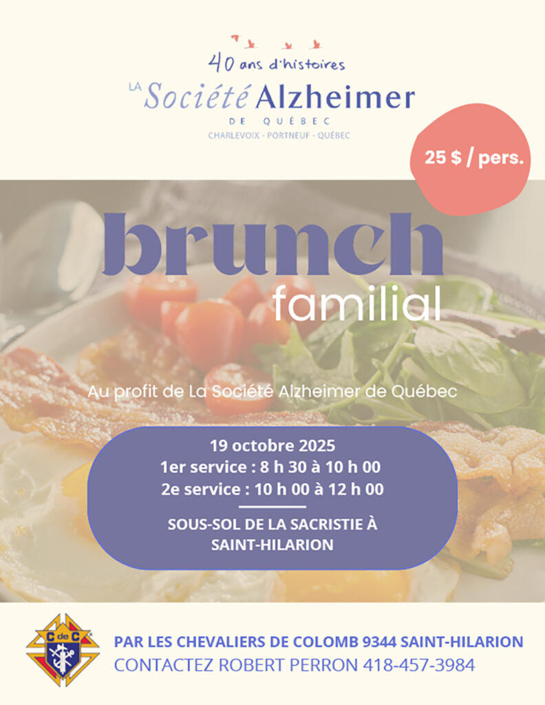 Brunch familial au profit de La Société Alzheimer de Québec à Saint-Hilarion ce dimanche.