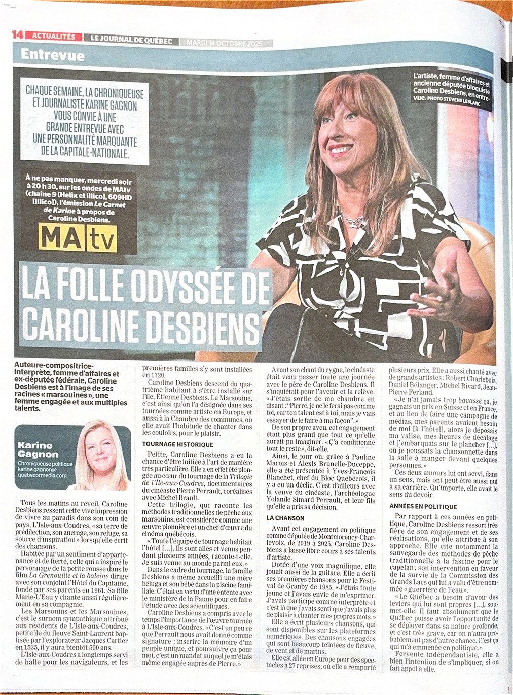 L’auteure-compositrice-interprète, femme d’affaires et ex-députée fédérale Caroline Desbiens est la vedette d’une entrevue captivante menée par la chroniqueuse Karine Gagnon dans sa rubrique vedette du Journal de Québec, « Le Carnet de Karine ». La grande dame de l’Isle-aux-Coudres y dévoile un parcours hors du commun, empreint de succès, de persévérance et d’une ambition jamais démentie.