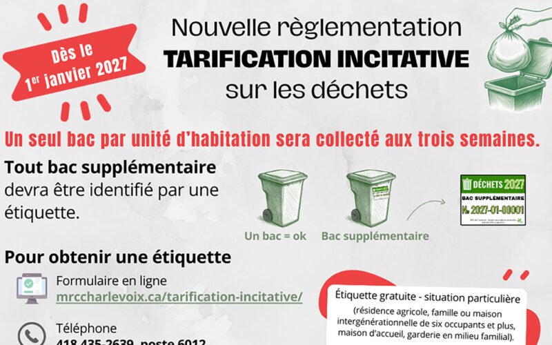 La MRC de Charlevoix annonce le lancement d’une démarche de transition vers la tarification incitative des déchets, une approche fondée sur le principe de l’utilisateur-payeur, qui entrera en vigueur sur l’ensemble du territoire à compter du 1er janvier 2027.