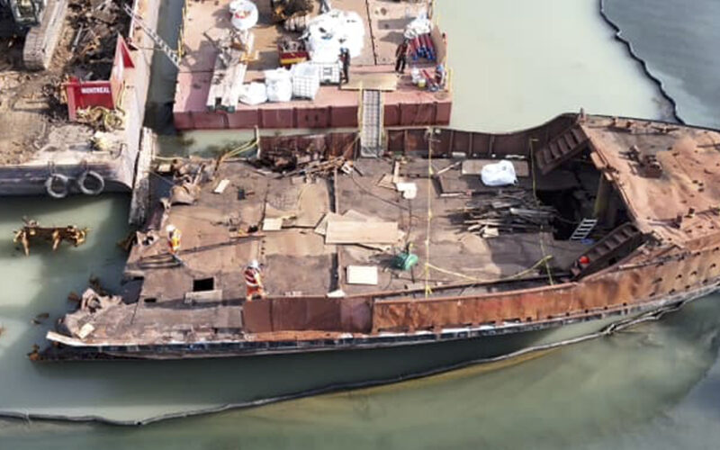 Un ancien traversier de l'Isle-aux-Coudres , La Marjolaine, est démantelé sur les berges du Lac Ontario.