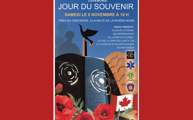 La Municipalité de Saint-Siméon accueillera la cérémonie du Jour du souvenir de Charlevoix le samedi 8 novembre à 10h00, au cénotaphe de la halte de la Rivière-Noire.