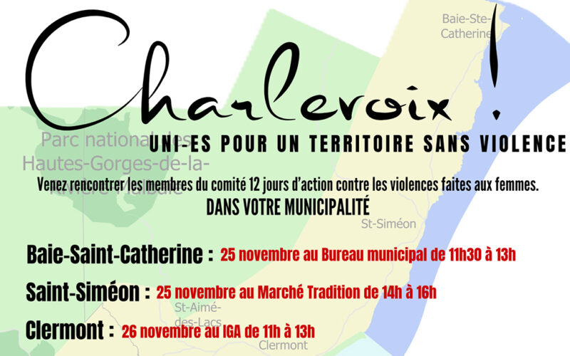 12 jours d’action contre les violences faites aux femmes : Charlevoix s’unit pour un territoire sans violence.