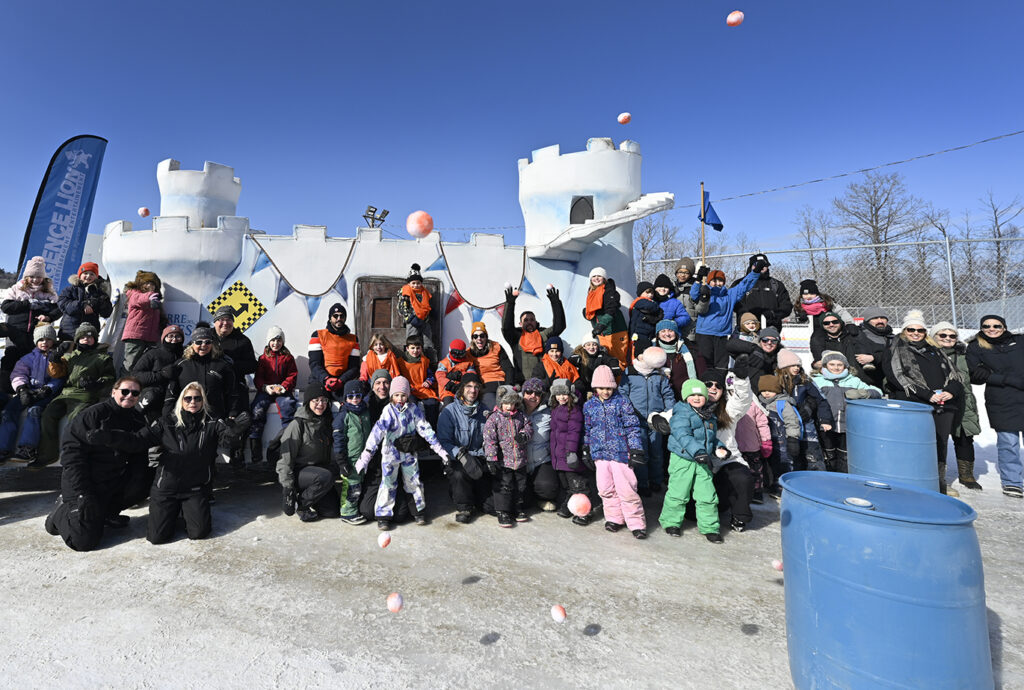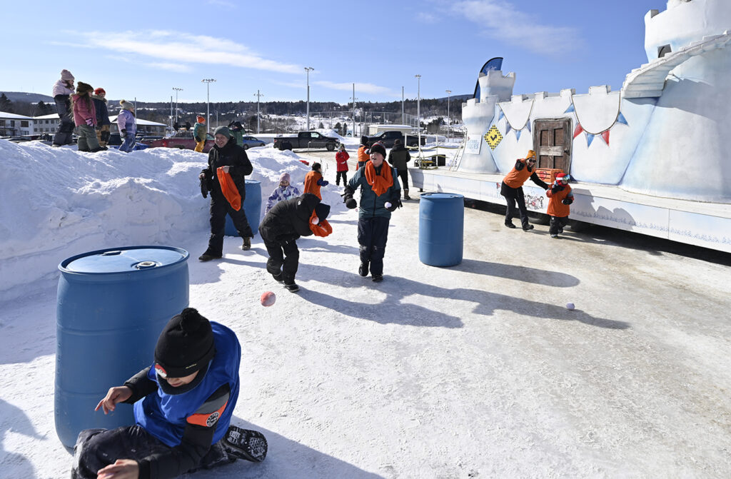 Simulations de « Guerre des tuques » : Les participants ont pu s’affronter amicalement en lançant des balles de mousse près d’un char allégorique en forme de fort de neige.