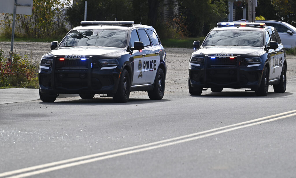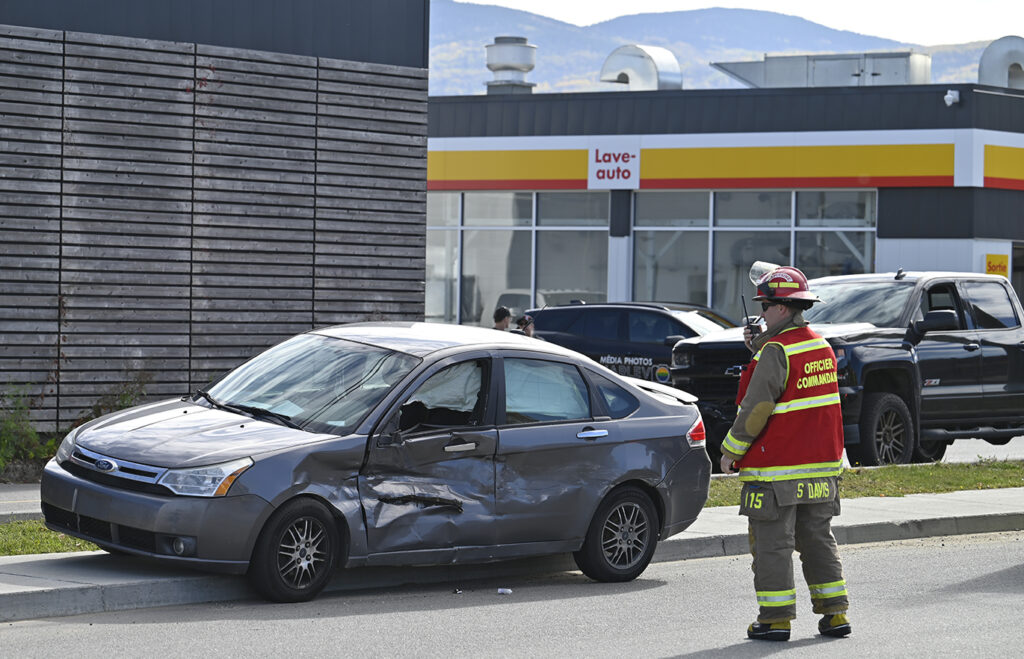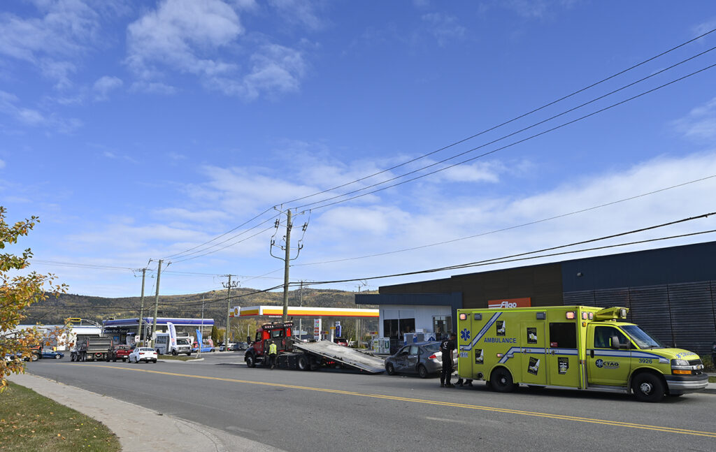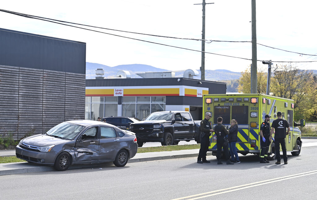 La collision est survenue sur le chemin de l’Équerre, alors qu’une camionnette sortait du stationnement du centre commercial adjacent à la station-service. Le pick-up a percuté le côté gauche du véhicule conduit par la jeune femme qui circulait sur la route.
