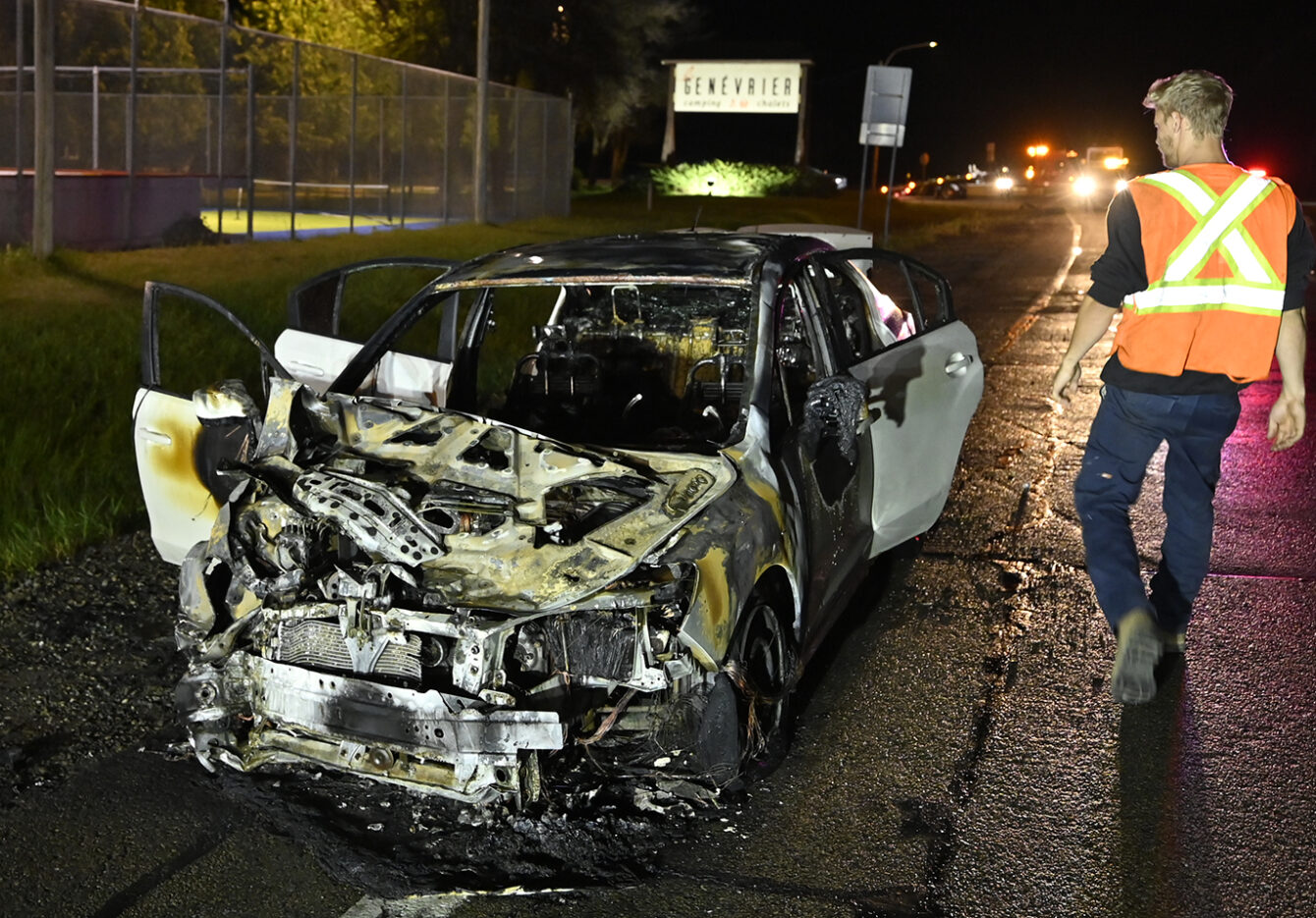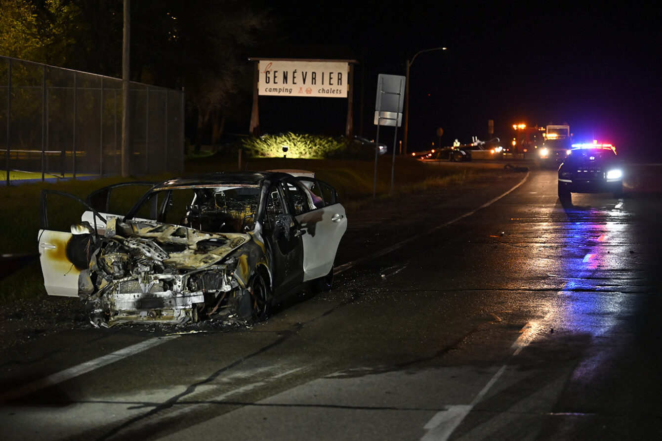 Une collision est survenue peu après 19h30 ce soir sur la route 138, près du camping Le Genévrier. L’accident a impliqué deux véhicules, dont un qui a pris feu à la suite de l’impact.