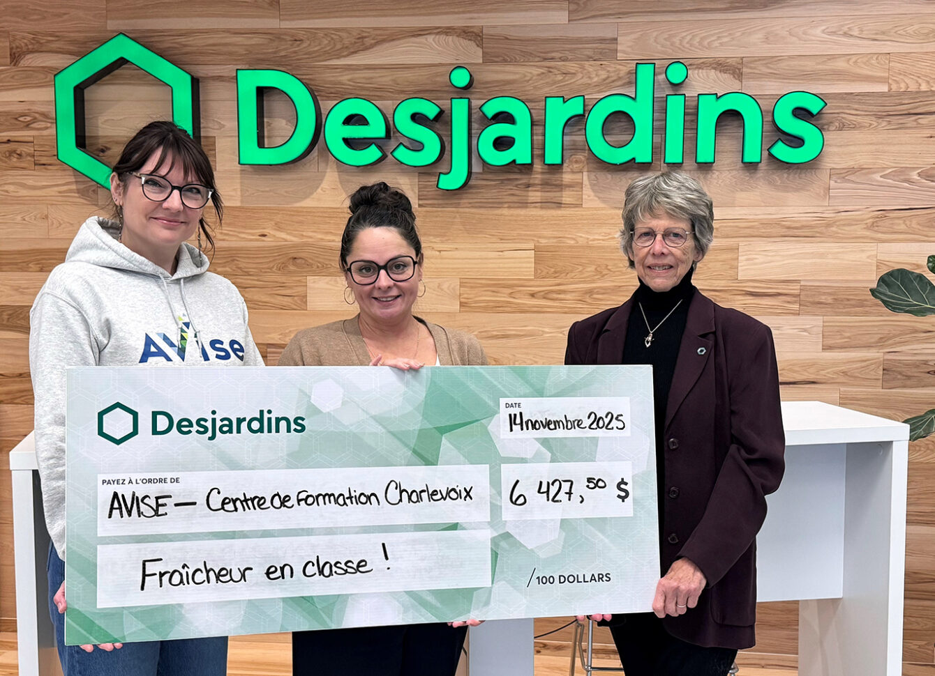 La Caisse Desjardins de Charlevoix est fière d’annoncer une contribution de 6 427,50 $, versée à partir de son Fonds d’aide au développement du milieu, au Centre de formation professionnelle AVISE pour soutenir le projet “Fraîcheur en classe”.