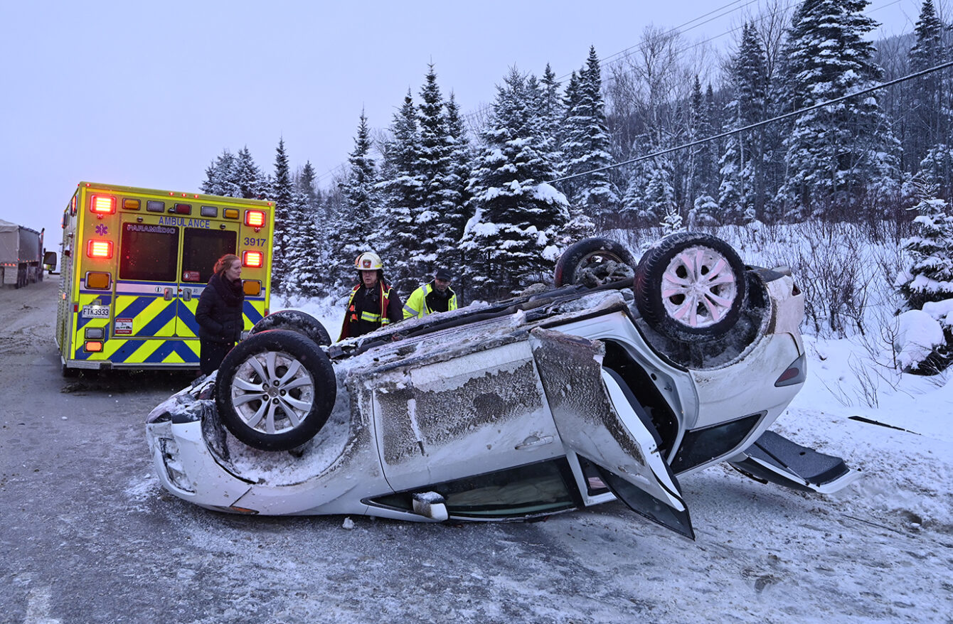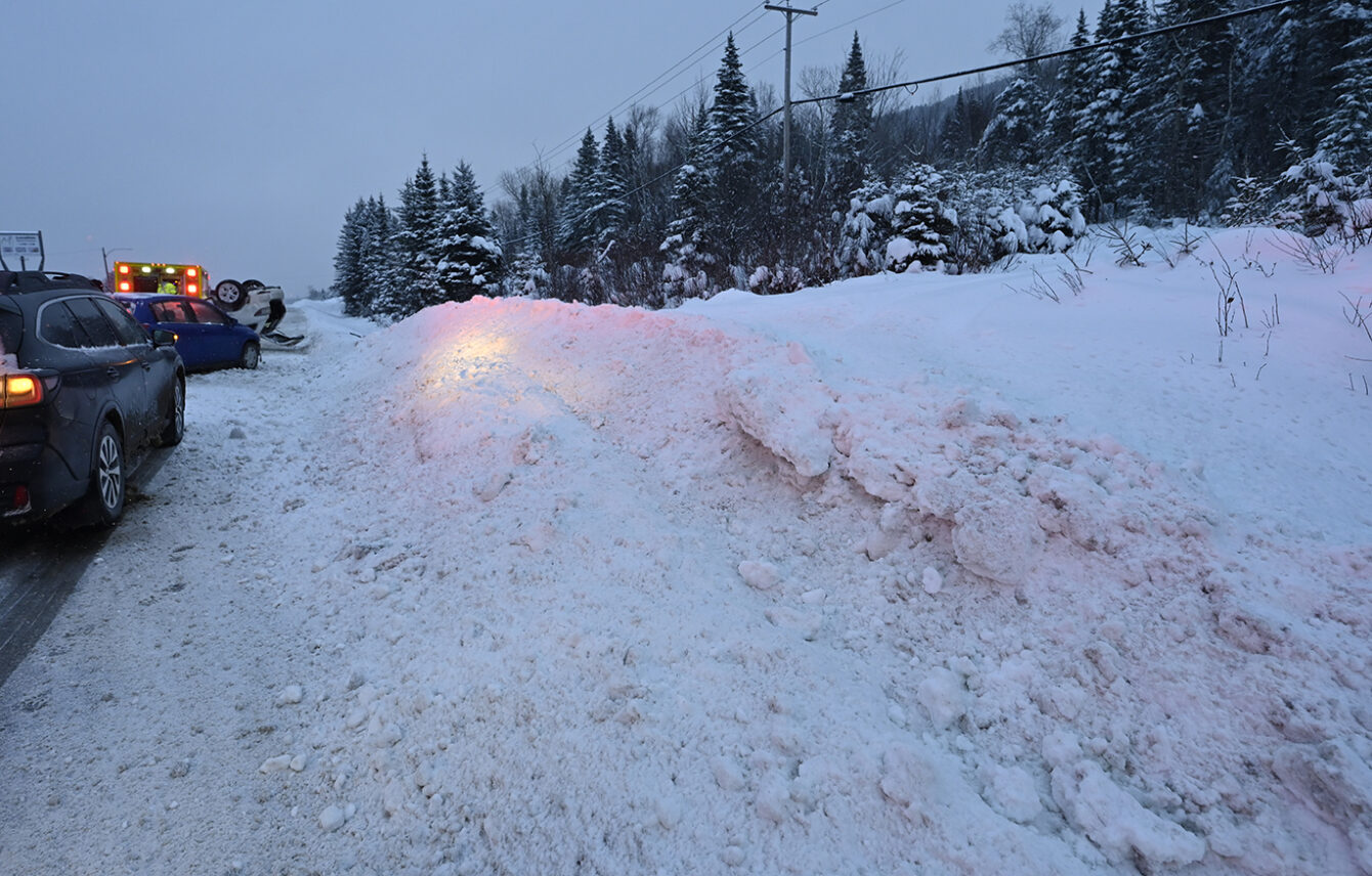 Le véhicule a heurté violemment le banc de neige à sa droite en bordure de route avant de terminer sa course sur le toit. Photo: Jean-François Desgagnés/MPC