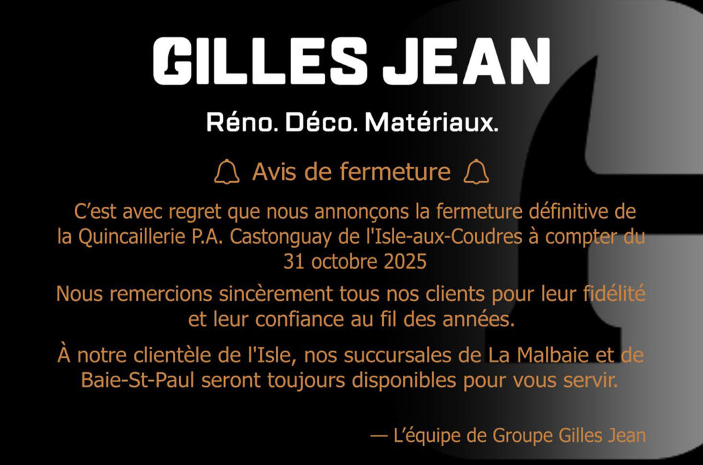 La Quincaillerie P.A Castonguay, à l’Isle-aux-Coudres sous la bannière Gilles Jean, ferme définitivement ses portes à compter du 31 octobre 2025. « C’est avec grand regret que nous devons faire cette annonce😔. Merci à toute la clientèle de Quincaillerie P.A. Castonguay de l’Isle-aux-Coudres. », peut-on lire sur la page Facebook du Groupe Gilles Jean.