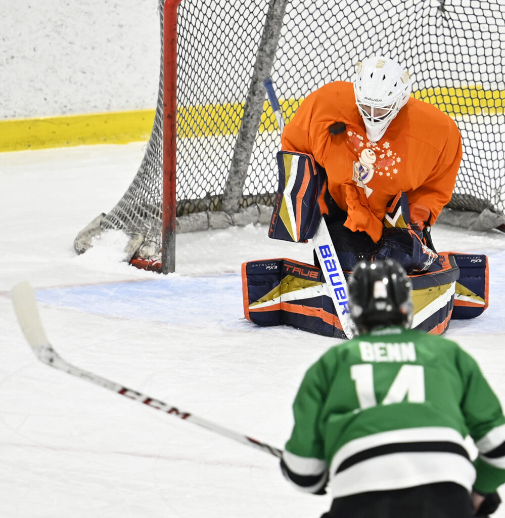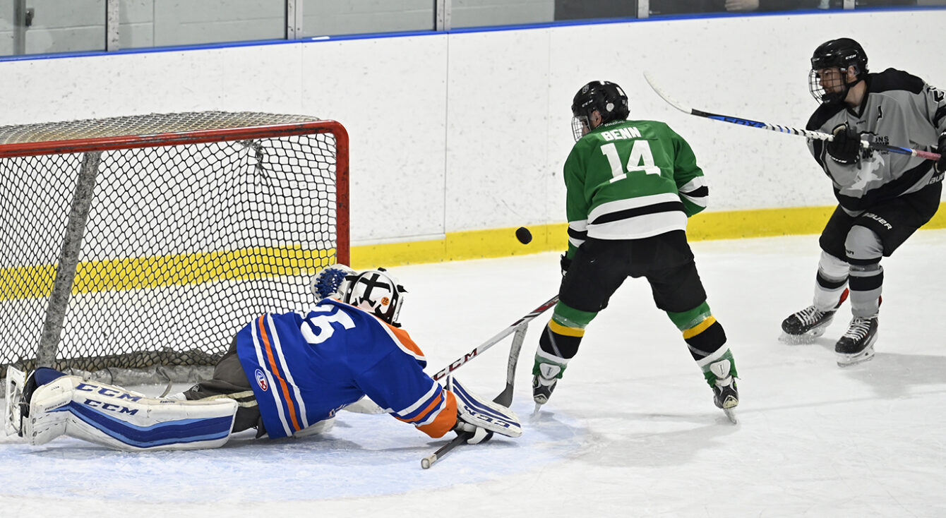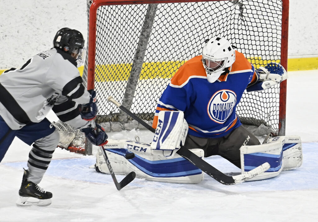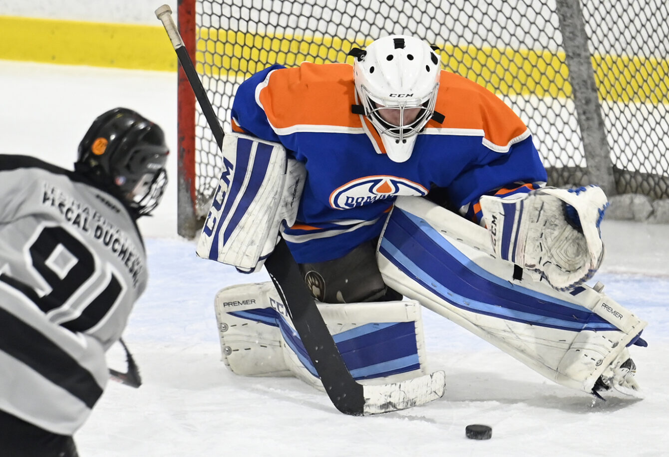 But de Francis Dufour entre les jambières du gardien en échappée. Photo : Jean-François Desgagnés/MPC