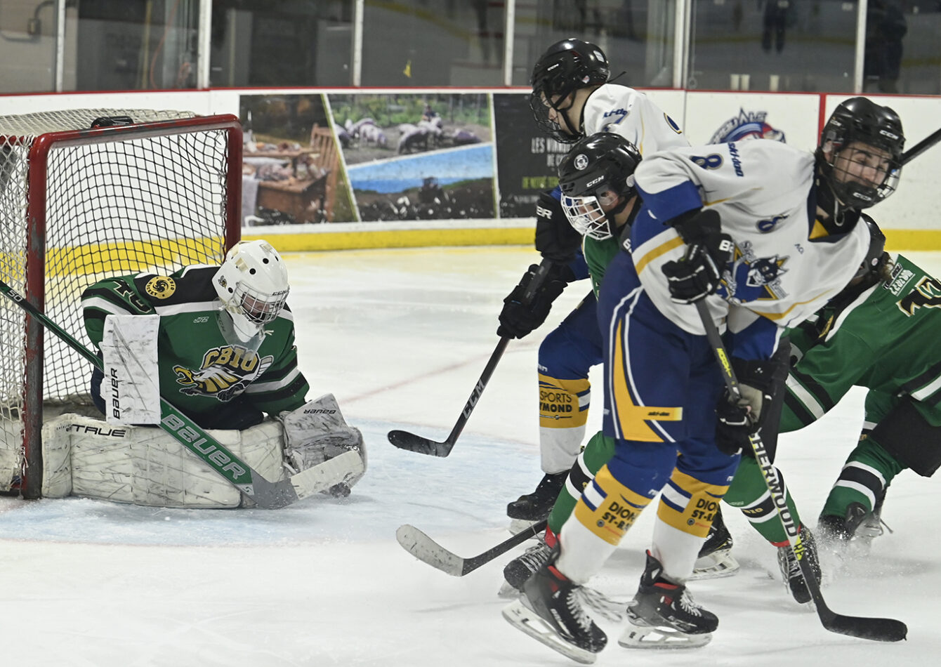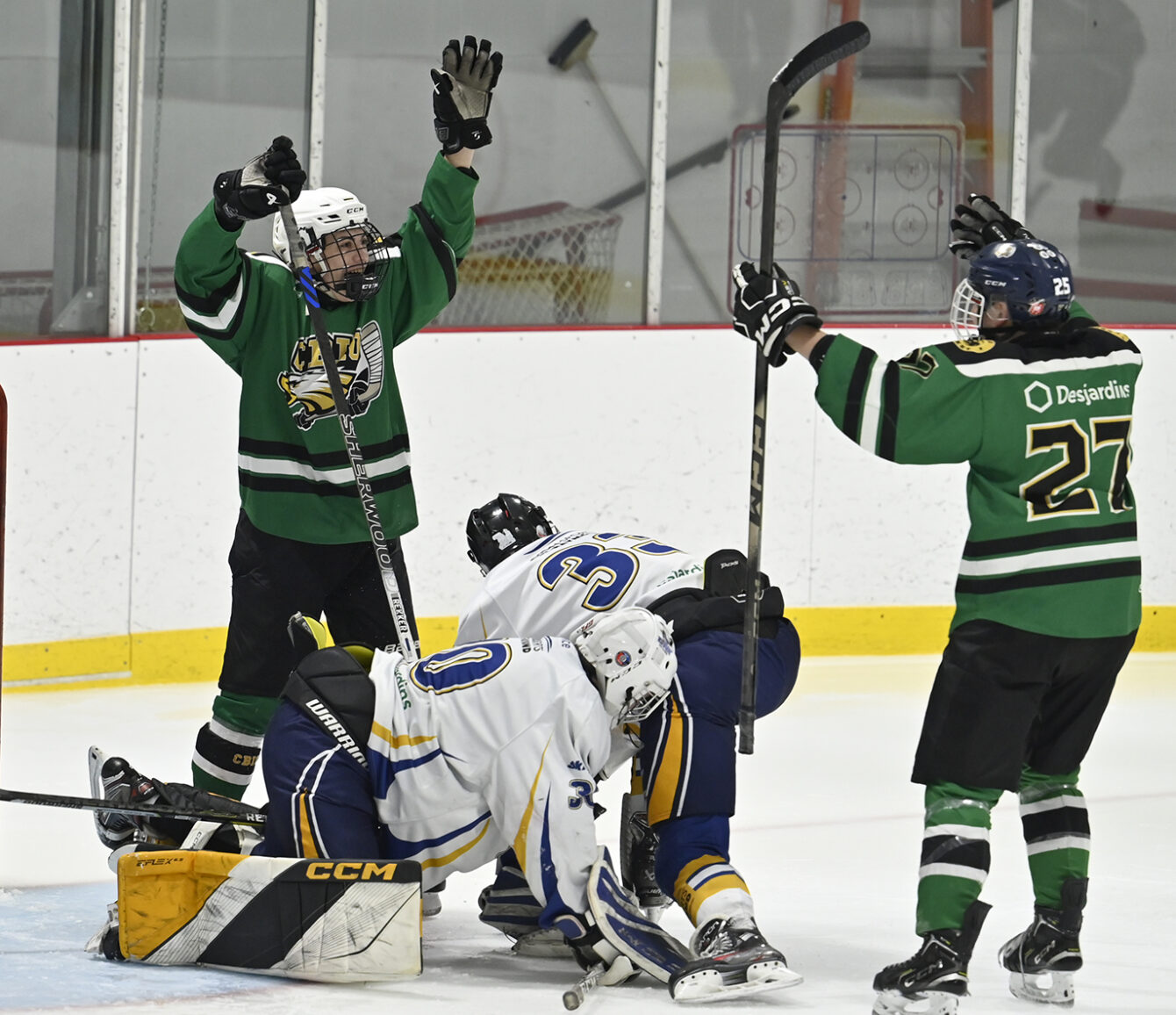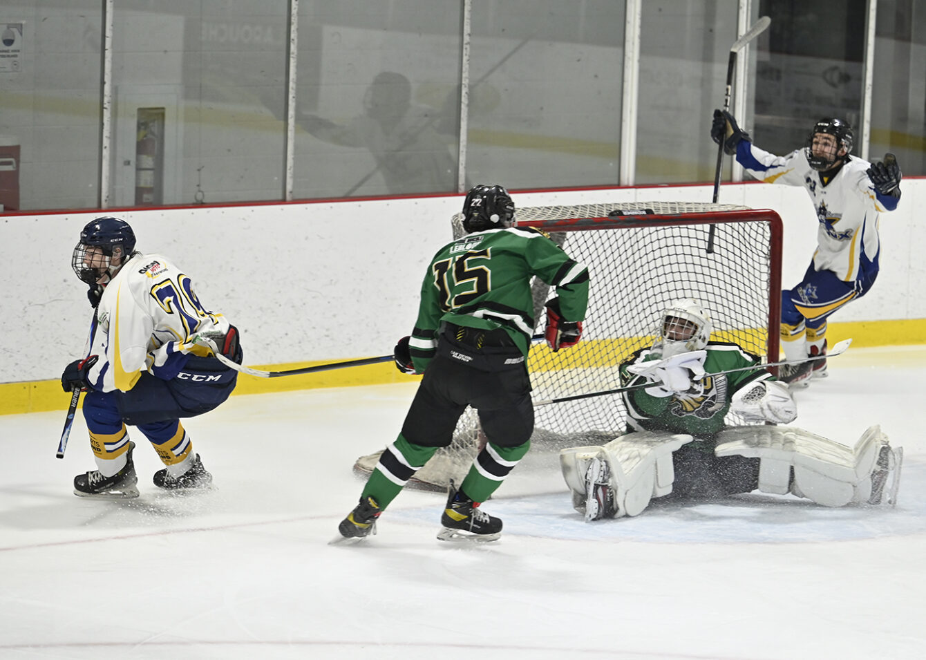 Les Lynx de Saint-Raymond contre les Aigles CBIO dans la catégorie C. Le but gagnant en prolongation du numéro 79, Batiste Poulin. Photo : Jean-François Desgagnés/MPC