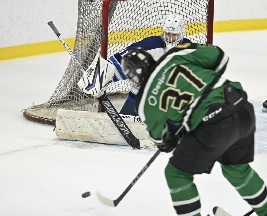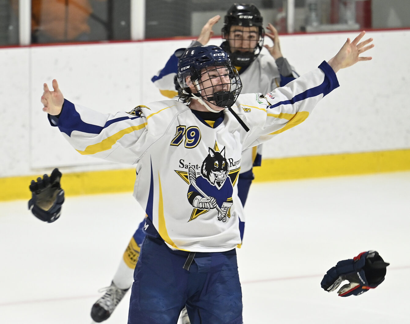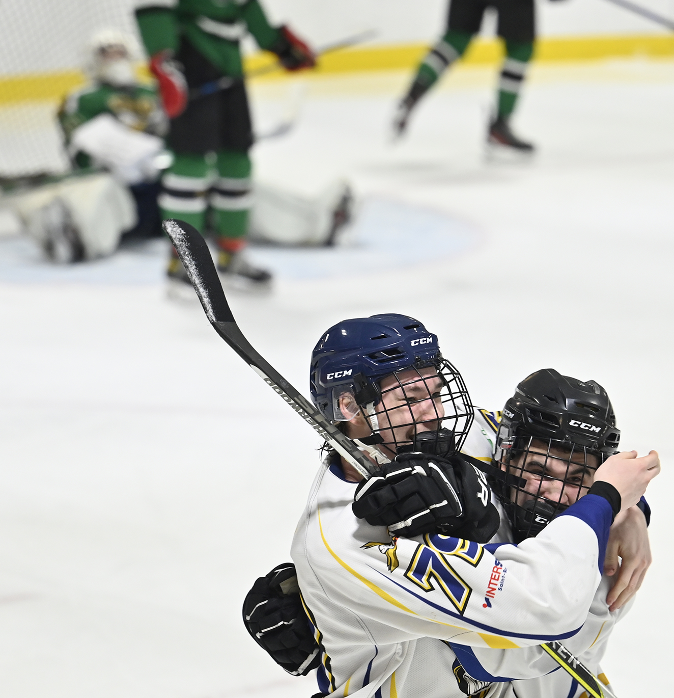 Les Lynx de Saint-Raymond contre les Aigles CBIO dans la catégorie C. Le but gagnant en prolongation du numéro 79, Batiste Poulin. Photo : Jean-François Desgagnés/MPC