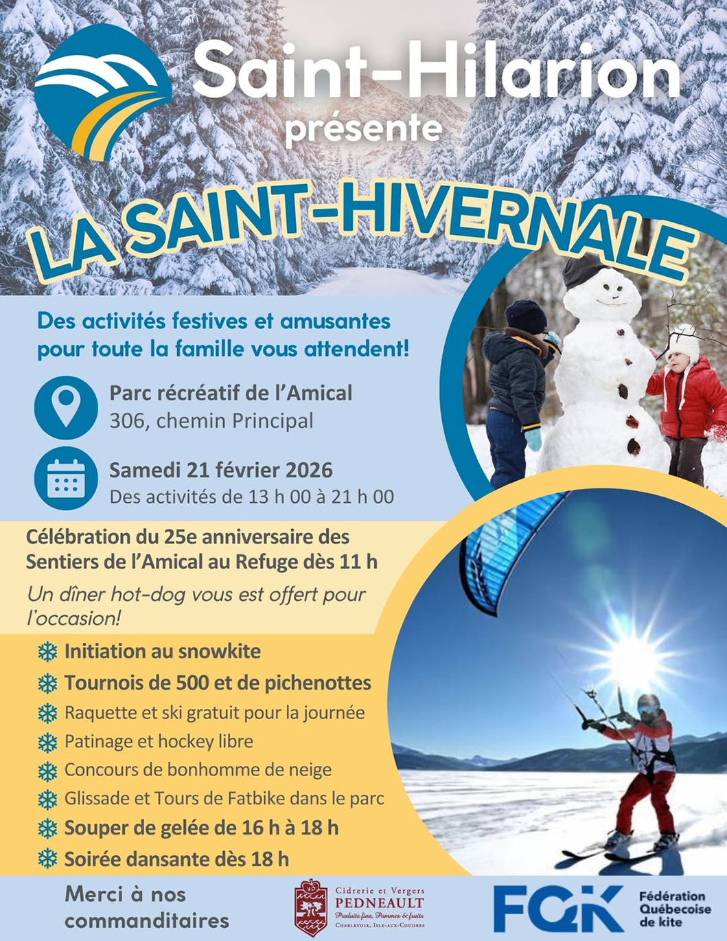 La 2ème édition de la Saint-Hivernale aura lieu le samedi 21 février prochain de 13 h à 21 h au Parc récréatif de l’Amical de Saint-Hilarion situé au 306, chemin Principal.