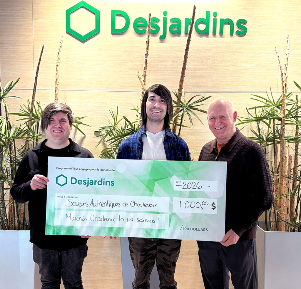 La Caisse Desjardins de Charlevoix est heureuse d’annoncer une contribution financière de 1 000 $ remise à Saveurs Authentiques de Charlevoix pour la tenue d’une série de marchés publics, offerts une fois par mois de février à mai, en alternance entre La Malbaie et Baie‑Saint‑Paul.