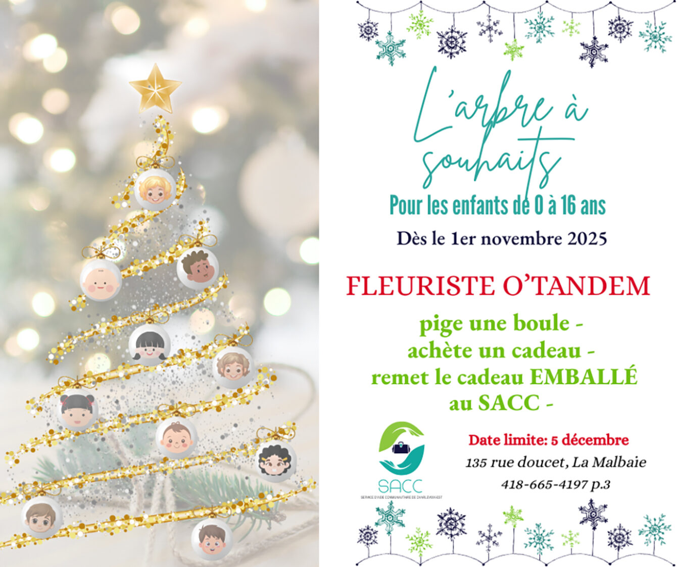 Ce projet repose sur une collaboration précieuse avec la communauté : dès le 1er novembre, des boules seront disponibles à la boutique Fleuriste au Tandem au centre commercial. Chaque boule représente un enfant de la région et précise le cadeau qu’il ou elle souhaite recevoir pour Noël. Les citoyennes et citoyens sont invités à choisir une boule parmi celles offertes, à se procurer le cadeau correspondant, à l’emballer soigneusement et à le rapporter au SACC au plus tard le 12 décembre.