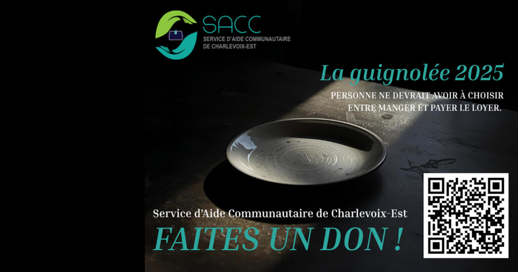 Alors que de nombreuses familles font face à des choix difficiles entre se nourrir, se chauffer ou se loger, le Service d’Aide Communautaire de Charlevoix-Est (SACC) lance sa Guignolée 2025. Cette campagne annuelle, essentielle pour la région, a pour but d’amasser des dons en argent afin de soutenir les personnes vivant en situation de vulnérabilité ou d’insécurité alimentaire durant la période des Fêtes.