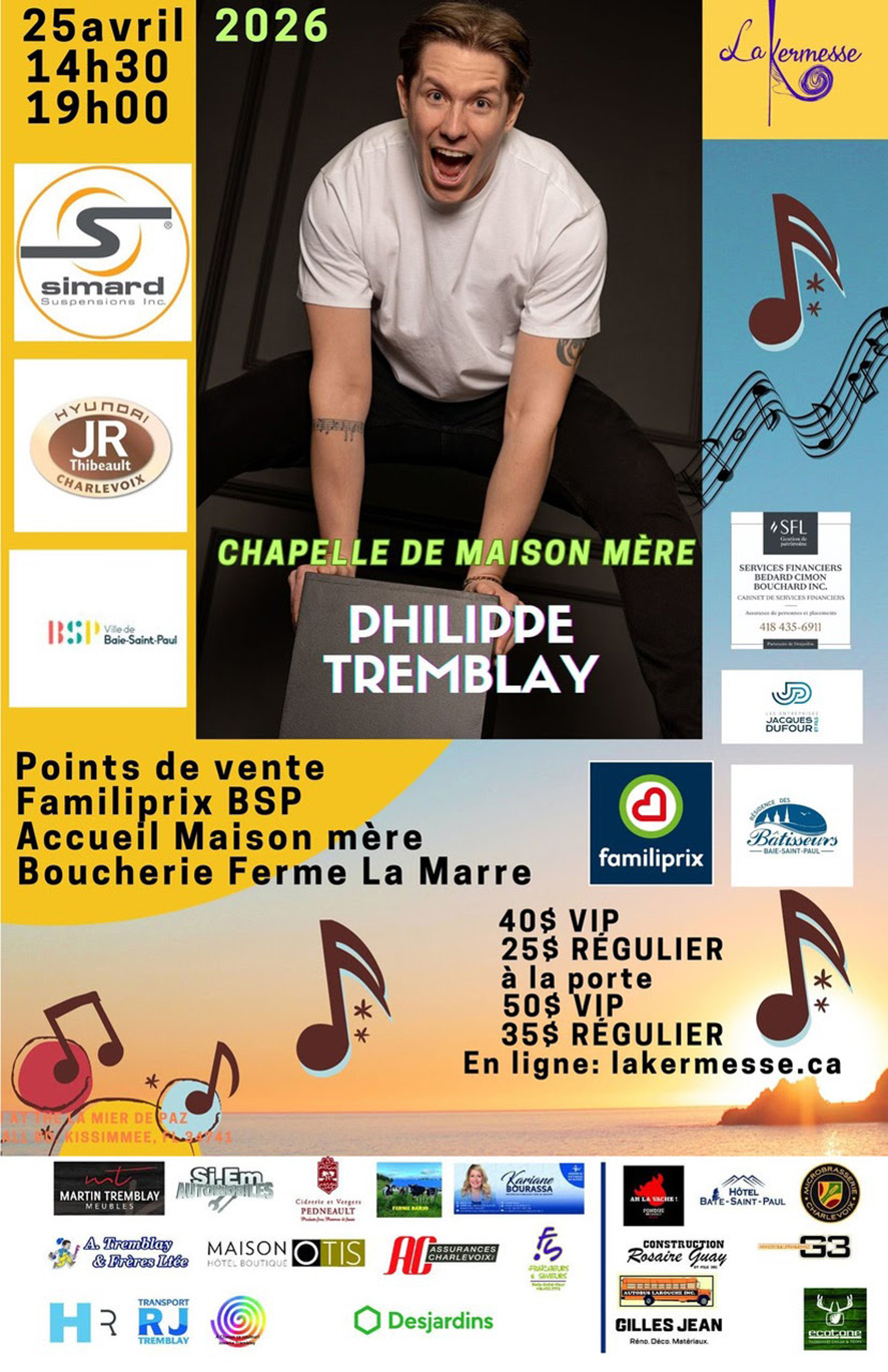 LA KERMESSE- L’auteur-compositeur-interprète malbéen Philippe Tremblay se produira en concert à la chapelle de Maison Mère de Baie-Saint-Paul le 25 avril prochain.