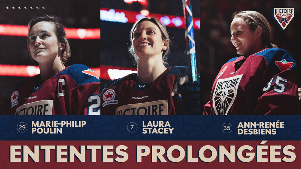MONTRÉAL (le 23 octobre 2025) – La Victoire de Montréal a annoncé jeudi avoir paraphé des prolongations de contrats avec les trois premières joueuses de son histoire : la capitaine Marie-Philip Poulin, la gardienne Ann-Renée Desbiens, ainsi que l’assistante capitaine Laura Stacey sont maintenant sous contrat jusqu’au terme de la saison 2027-2028. Elles ont toutes les trois connu des saisons 2024-2025 exceptionnelles avec la Victoire, méritant toutes des prix au gala de la LPHF, en plus d’aider l’équipe nationale canadienne à mettre la main sur la médaille d’argent lors du championnat mondial en avril.