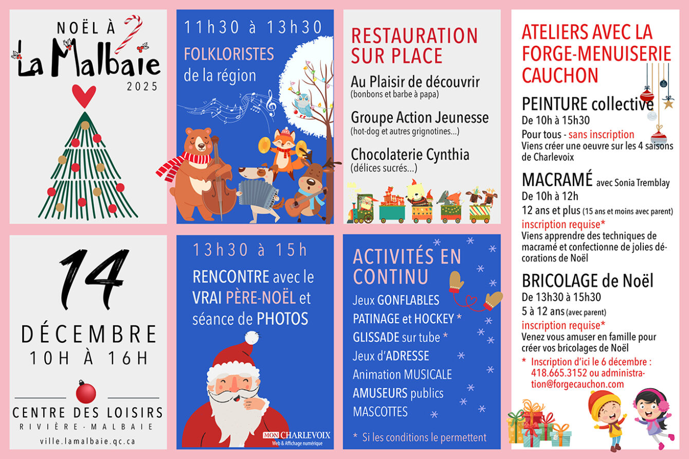 La Ville de La Malbaie a le plaisir d’annoncer le retour de « Noël à La Malbaie », une fête familiale gratuite qui se tiendra le dimanche 14 décembre 2025, de 10h à 16h, au Centre des Loisirs de Rivière-Malbaie (65, rue Girard, La Malbaie).