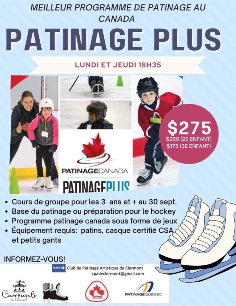 La saison du Patinage Plus débutera le 22 septembre et jusqu’à la mi-mars, pour un total d’environ 38 séances, soit le lundi et le jeudi soir.