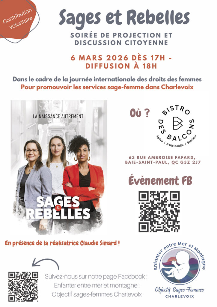 Le groupe citoyen Enfanter entre Mer et Montagnes, qui milite pour la mise en place d’un service de sage-femme dans Charlevoix poursuit sa mobilisation et souligne la Journée internationale des droits des femmes en proposant la projection du documentaire Sages et Rebelles, le 6 mars prochain, ouverture des portes dès 17h, au Bistro des Balcons. Pour l’occasion, nous avons le plaisir d’accueillir la réalisatrice du documentaire Claudie Simard qui sera là avec nous !
