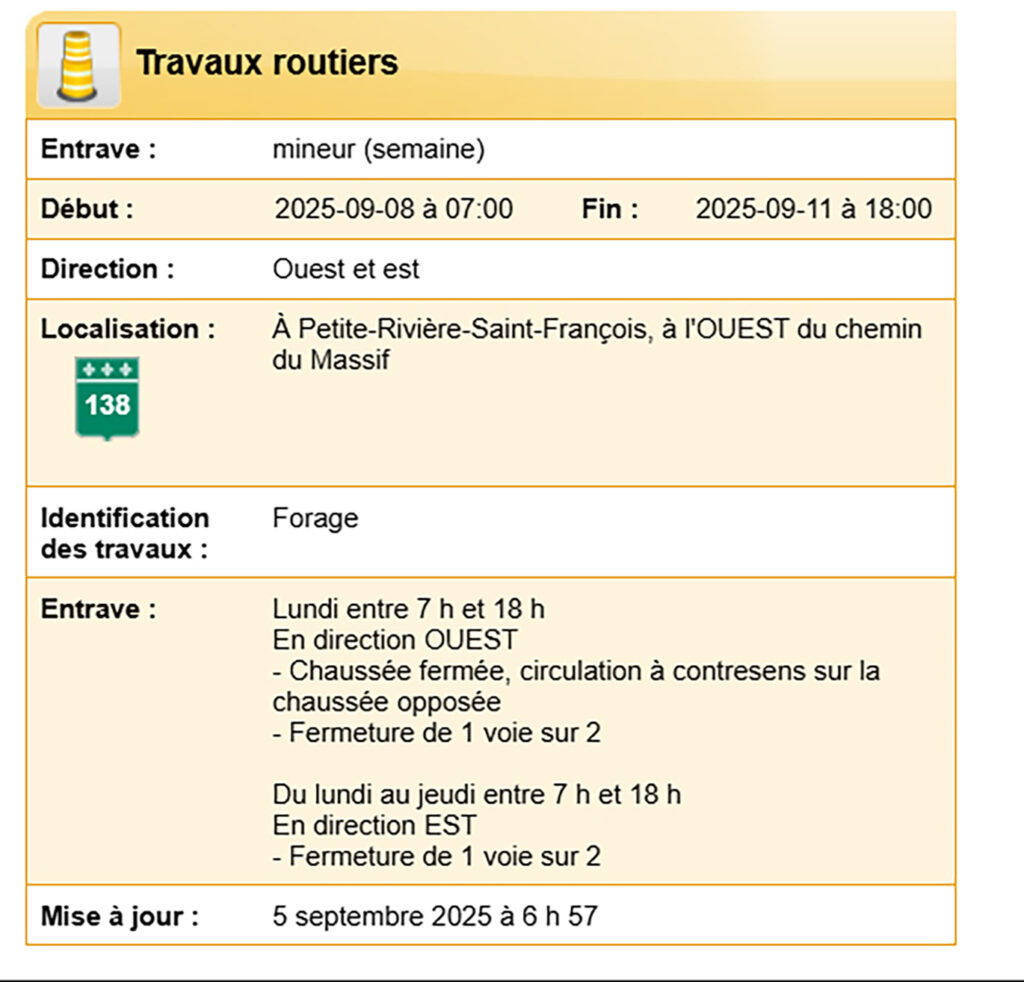 Le ministère des Transports et de la Mobilité durable a annoncé que des travaux de forage se dérouleront sur la route 138 à Petite-Rivière-Saint-François, à l’ouest du chemin du Massif, du 8 au 11 septembre.