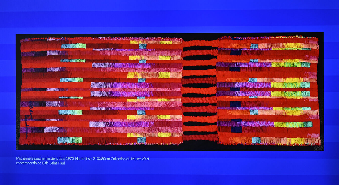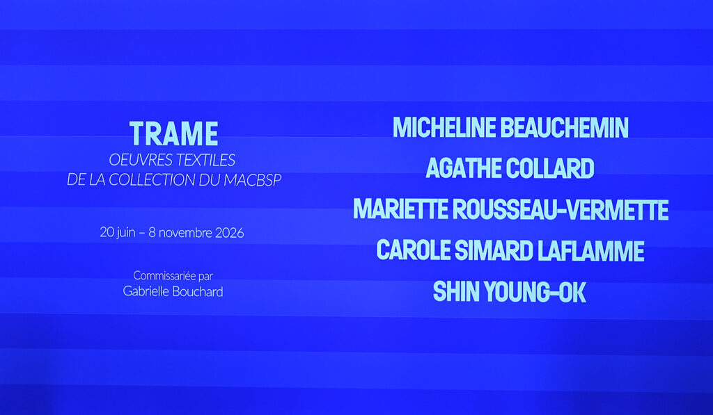 À la mezzanine, l’exposition Trame réunira une sélection d’œuvres textiles issues de la collection du Musée, créées par Micheline Beauchemin, Agathe Collard, Mariette Rousseau-Vermette, Carole Simard Laflamme et Shin Young-Ok. En mettant en dialogue des pratiques historiques et contemporaines, cette présentation soulignera la richesse et la vitalité de l’art textile, ainsi que son influence persistante sur les démarches actuelles. À l’intersection de la tradition et de l’expérimentation, les œuvres témoigneront de la capacité du médium à se renouveler et à s’inscrire dans les préoccupations esthétiques et conceptuelles d’aujourd’hui. Commissariat par Gabrielle Bouchard, directrice générale du MACBSP.