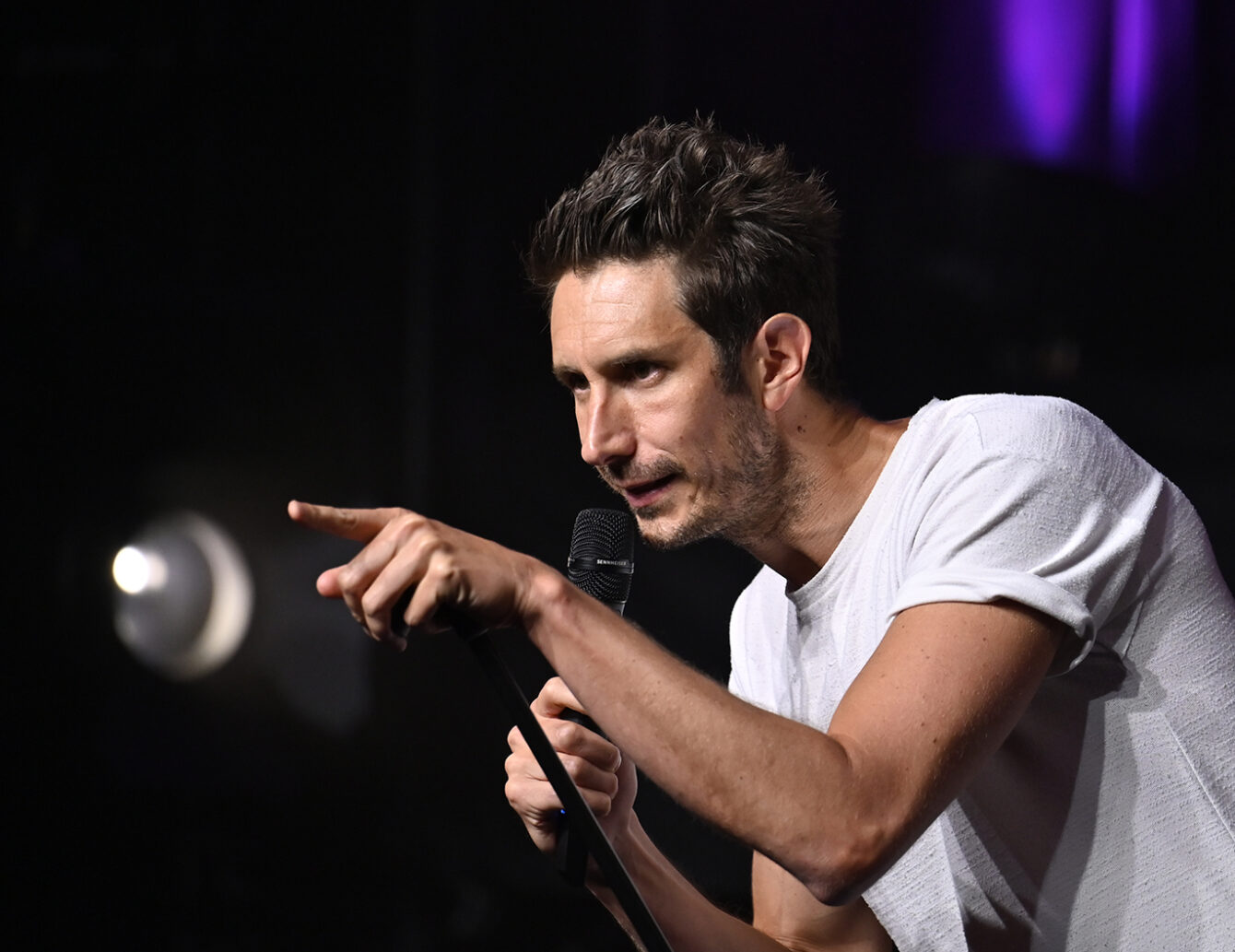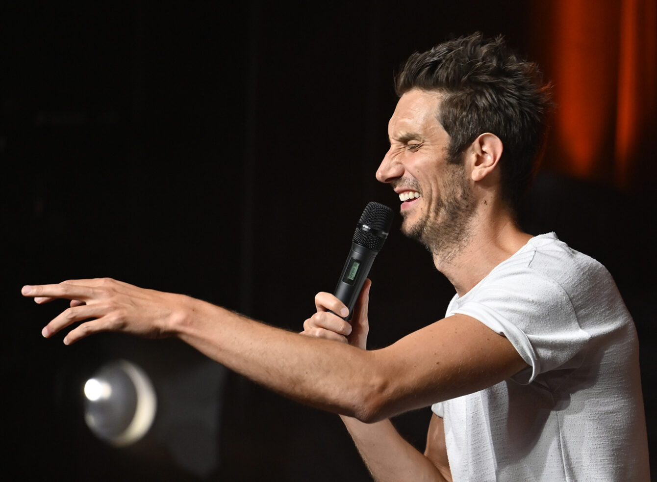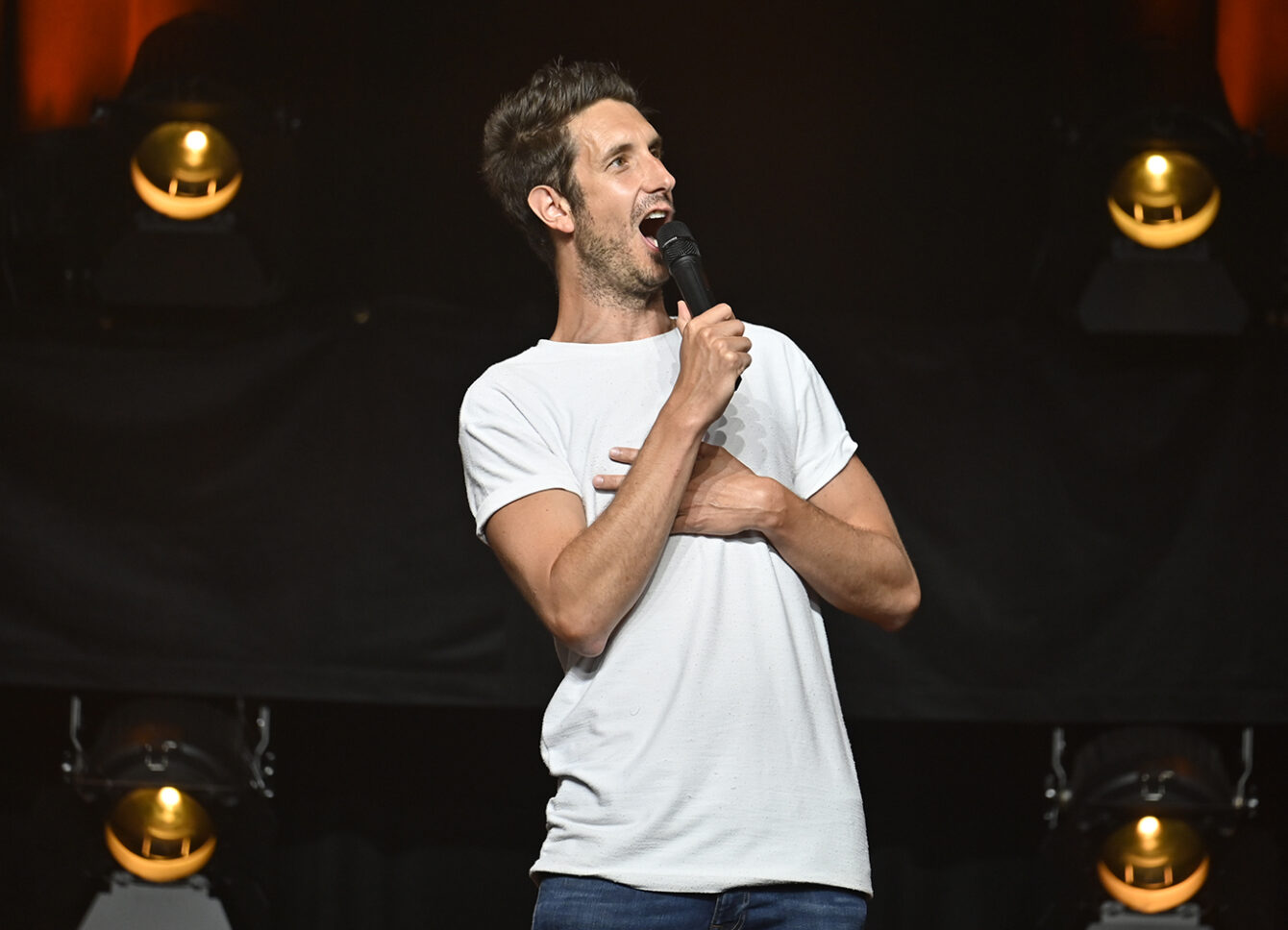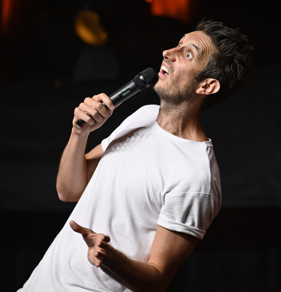 Le public a eu droit à un spectacle déjanté dans un hangar bondé. L’humoriste d’origine française, en très grande forme, a conquis la foule dès le départ. Il a d’ailleurs interagi avec plusieurs spectateurs, dont Tony, Sylvie, Alain et Johanne.