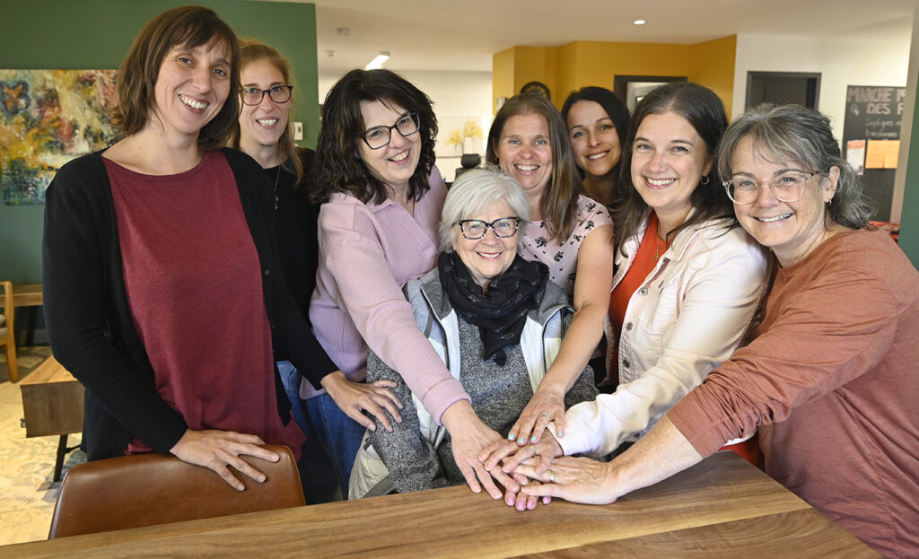 Rosi entouré de sa nouvelle « famille d'amis », l'équipe du Centre des Femmes de Charlevoix à Baie-Saint-Paul. Photo: Jean-François Desgagnés/MPC
