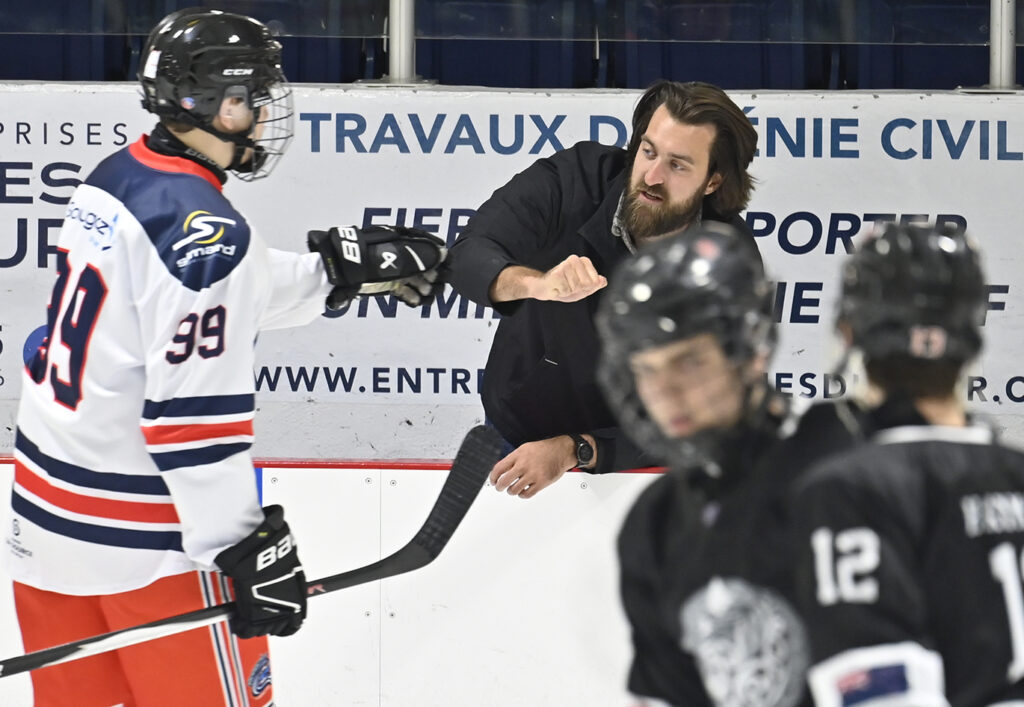 Match de hockey entre les Rorquals M18A de Charlevoix contre une équipe de la Nouvelle-Zélande à l'aréna de Baie-Saint-Paul. Jean-Christian Lavoie derrière le banc. Photo: Jean-François Desgagnés/MPC