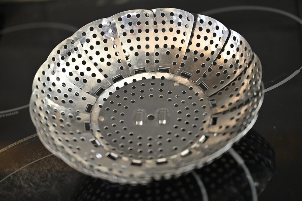 Réponse : l'ustensile "marguerite"- Fonction: Il s'agit d'un panier pliable ou d'un support en forme de fleur qui s'adapte à différentes tailles de casseroles. Utilisation: On le place dans une casserole d'eau bouillante, les aliments à cuire étant disposés sur les "pétales" de la marguerite. Avantages: La cuisson à la vapeur préserve les saveurs et les nutriments des aliments et ne nécessite pas l'ajout de matières grasses. Matériaux: On trouve des marguerites en plastique, en métal, ou en inox. Adaptabilité: Elles peuvent s'utiliser avec des casseroles de différentes tailles. Photo: Jean-François Desgagnés/MPC