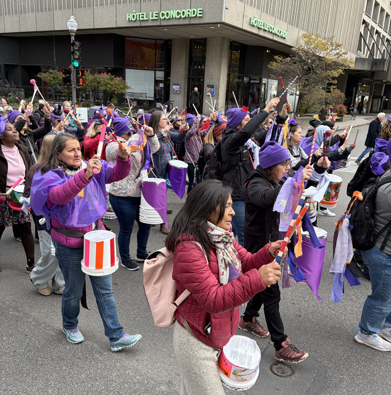 Le Centre-Femmes aux Plurielles et le Centre des Femmes de Charlevoix offraient le transport gratuitement pour cette journée en plus d’avoir proposé plusieurs activités de sensibilisation en lien avec les revendications de la marche. Une partie du groupe a participé activement à l’animation en jouant des batucadas lors des prises de parole et des chansons thématiques. Ces instruments à percussion artisanaux ont été fabriqués par des femmes fréquentant les deux organismes.
