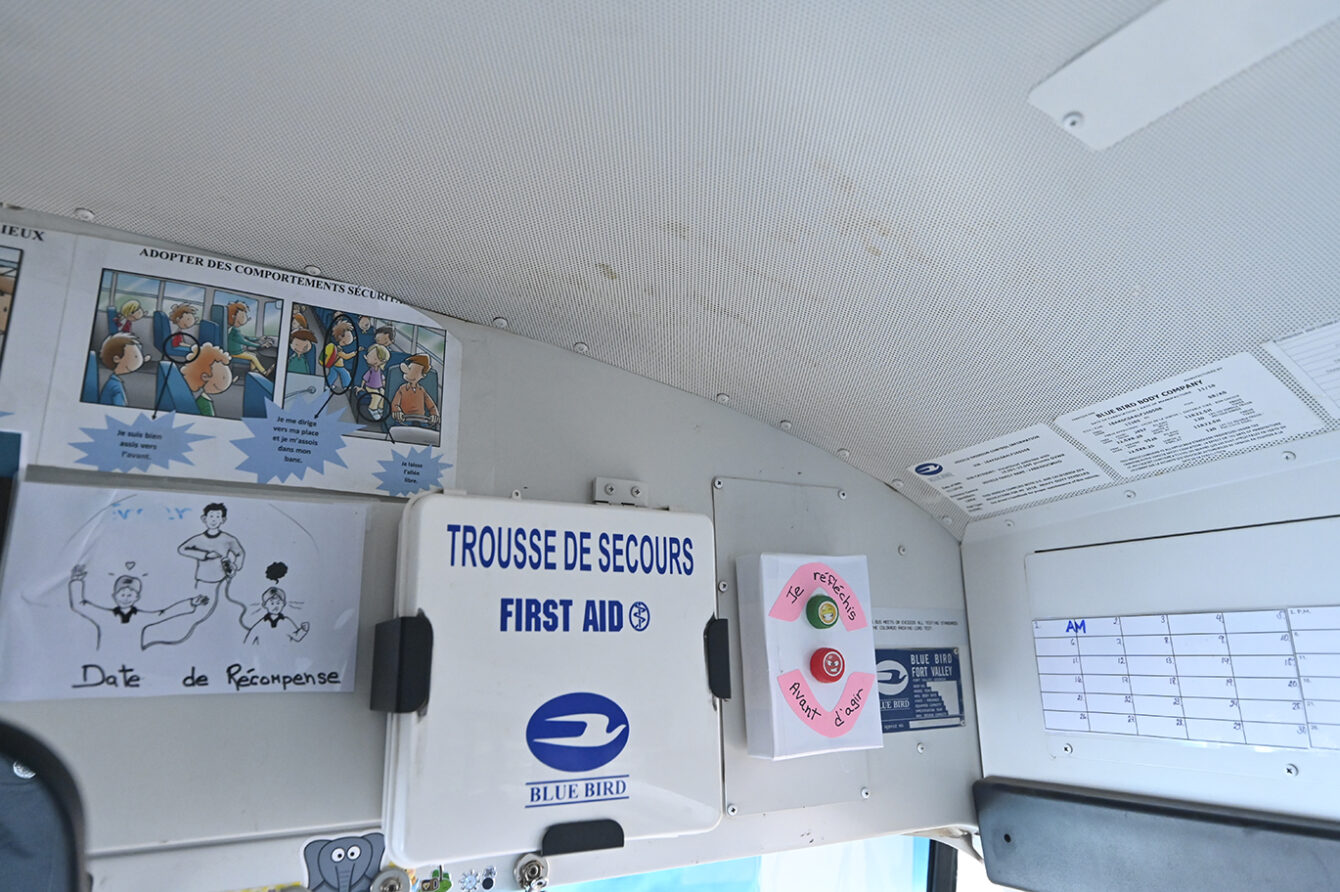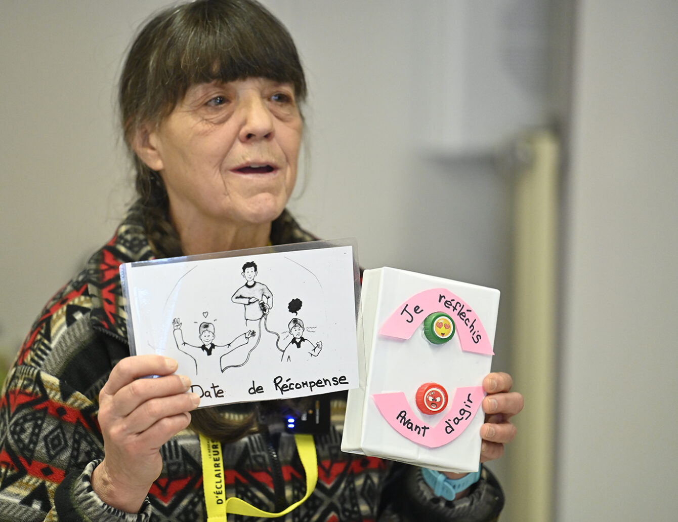 Le cœur du projet repose sur un outil original conçu par les bénévoles : une manette de discipline artisanale. Installé de façon bien visible dans l’autobus, cet outil affiche deux messages clés : « Réfléchir » (en vert) et « Avant d’agir » (en rouge).