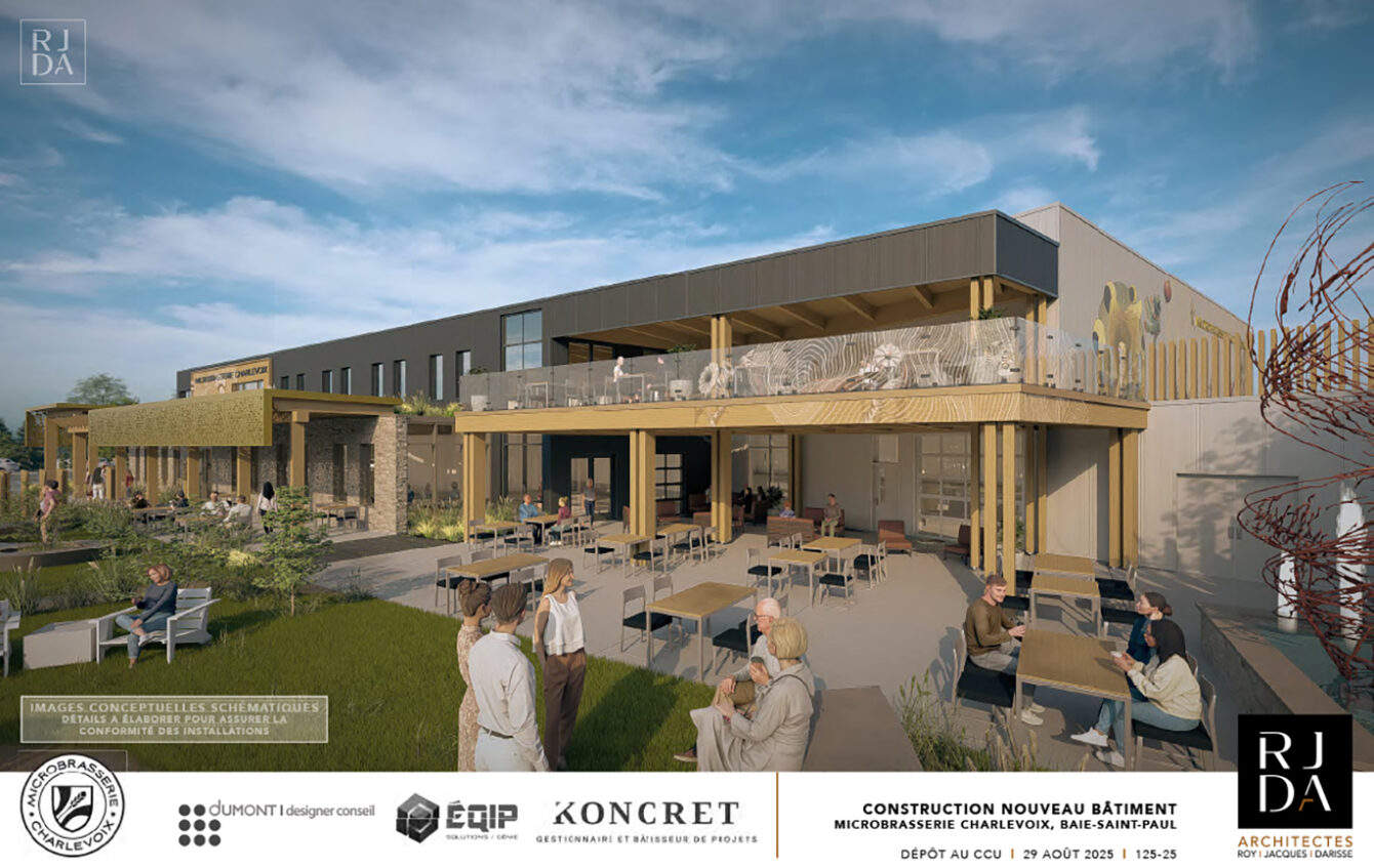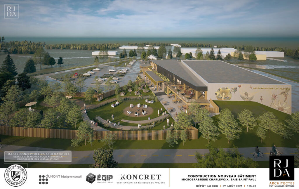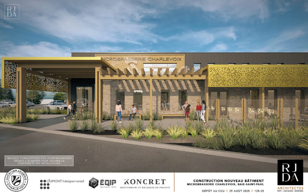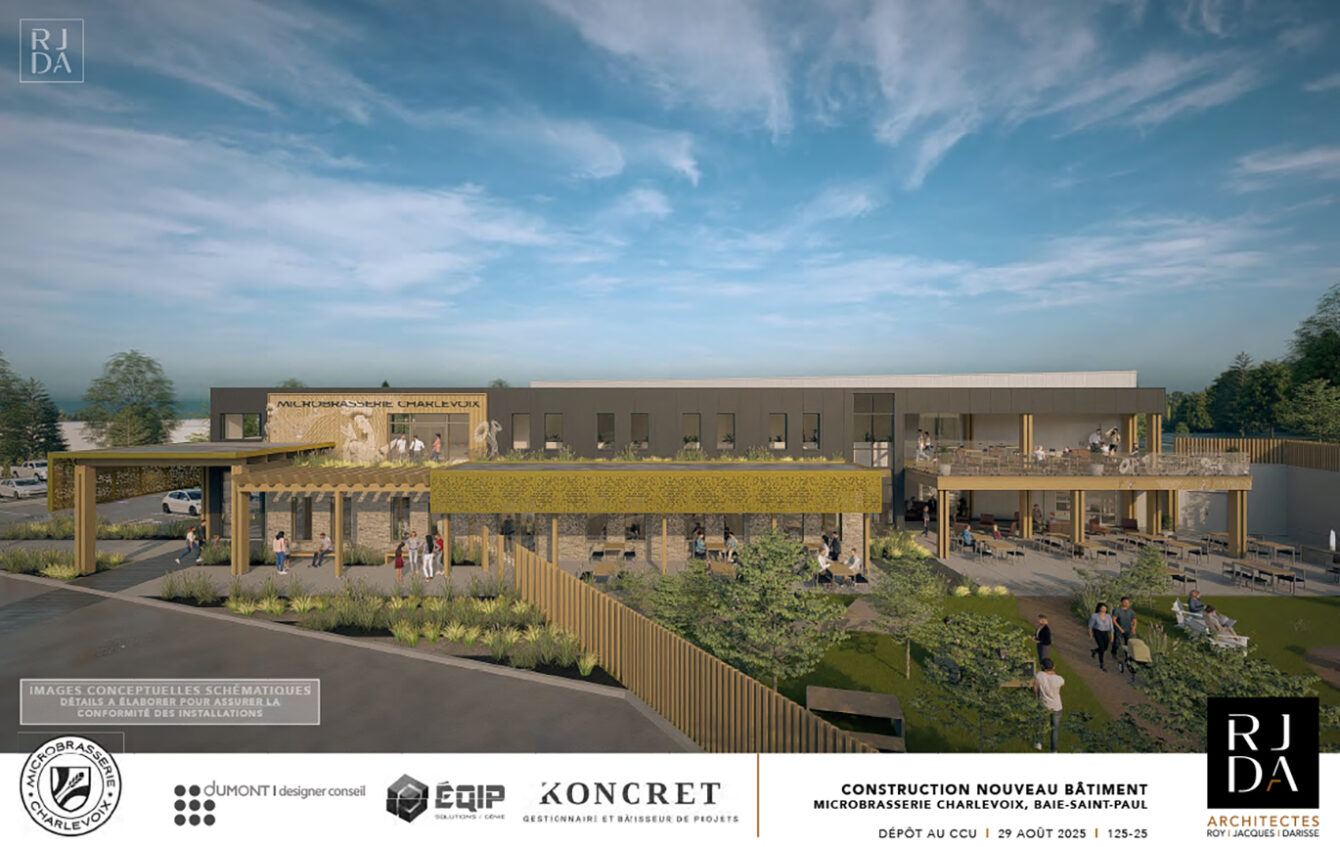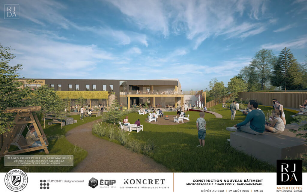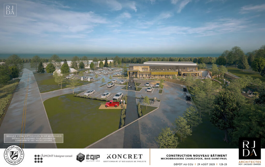 Le projet va bien au-delà d’une simple expansion de production. Situé stratégiquement à deux pas du Golf de Baie-Saint-Paul et intégré à l’Écoquartier des Moissons, le nouveau complexe se veut une destination complète. L’expérience client sera transformée grâce à un espace dédié de 6 000 pieds carrés inspiré des célèbres Biergarten européens, tout en conservant une « touche bien charlevoisienne », selon Caroline Bandulet.
