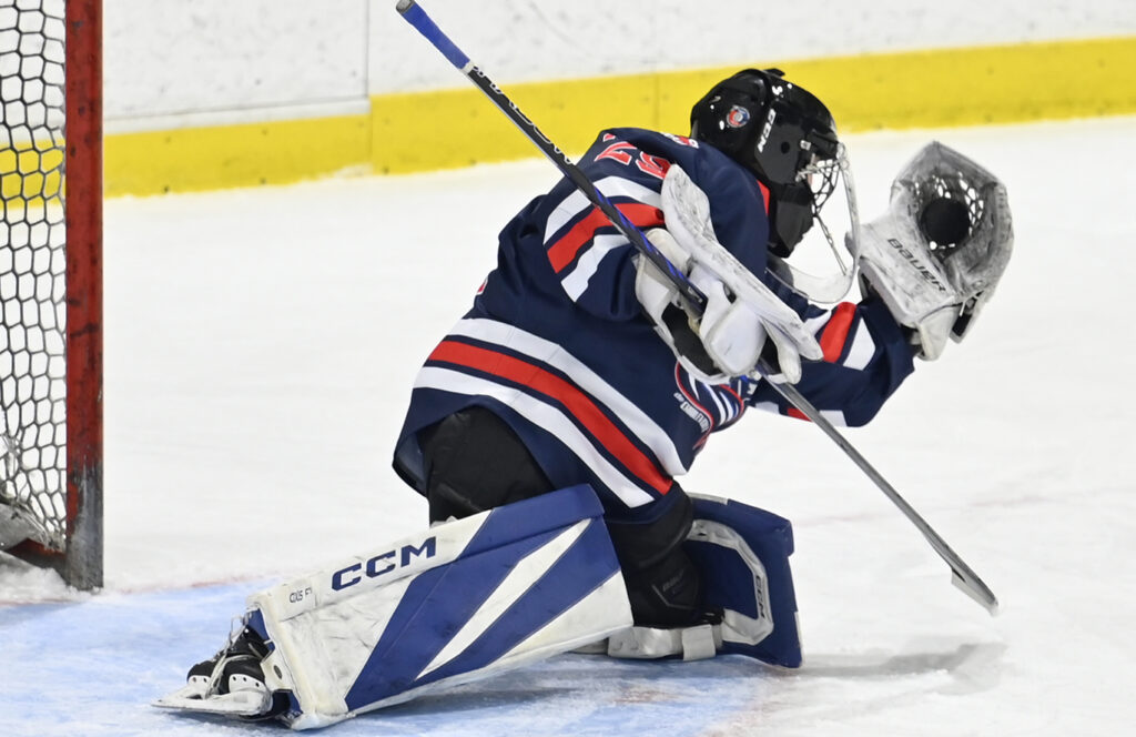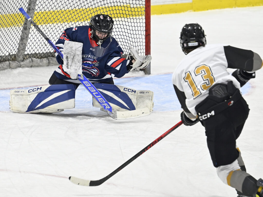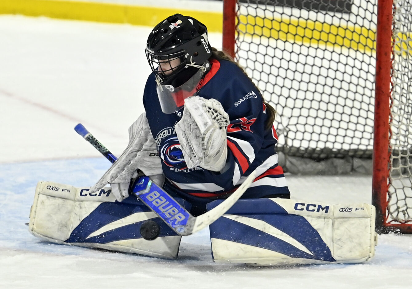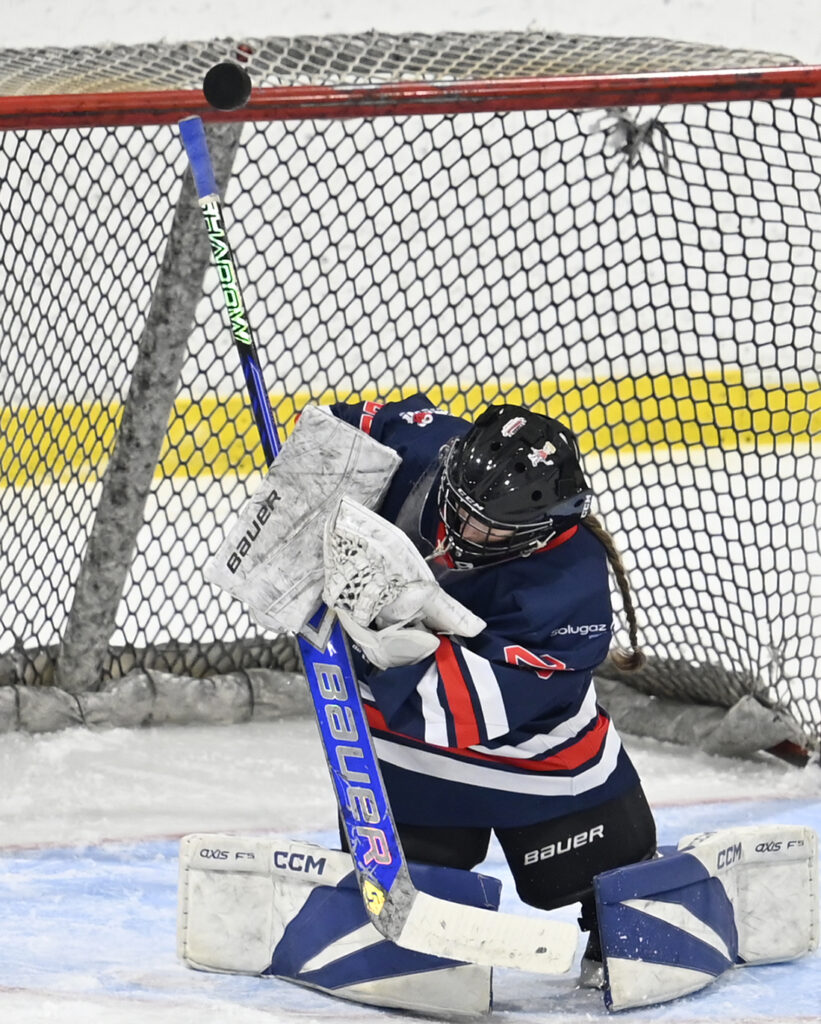 La gardienne des Rorquals, Aïcha Ferland, a connu une solide performance malgré un troisième but chanceux des Seigneurs, où la rondelle a glissé lentement entre ses jambières pour franchir la ligne de but. Photo : Jean-François Desgagnés/MPC