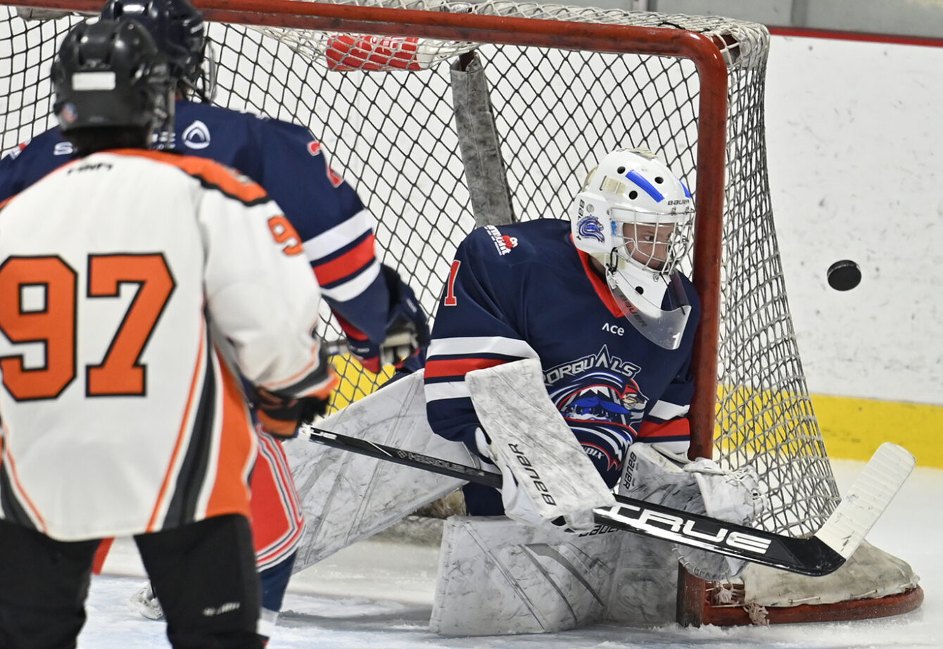 Les Rorquals M18 B de Charlevoix ont subi un revers de 4 à 0 ce matin face aux Dynamos, à l'occasion de leur deuxième match du Tournoi M18 de Baie-Saint-Paul, présenté à 11h00. Le gardien, Charly Dupuis. Photo: Jean-François Desgagnés/MPC