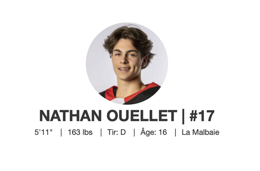 Originaire de Charlevoix, Nathan Ouellet évolue présentement avec le Blizzard du Séminaire Saint-François au niveau M18 AAA. L’attaquant de 5’11 » et 163 lbs, qui tire de la droite, a vu ses performances récompensées par cette première promotion au circuit junior majeur.