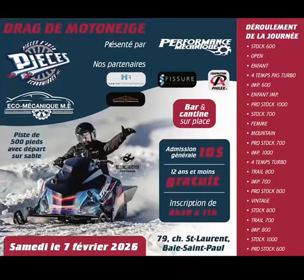 BAIE-SAINT-PAUL – Les amateurs d’adrénaline et de sports motorisés ont une date à encercler en rouge sur leur calendrier. Le promoteur, Michel Tremblay, du garage Éco-mécanique M.E., a confirmé en exclusivité à Média Photos Charlevoix la tenue d’un tout nouvel événement de DRAG DE MOTONEIGE le samedi 7 février 2026, à Baie-Saint-Paul.