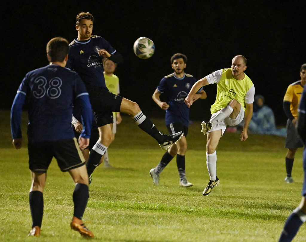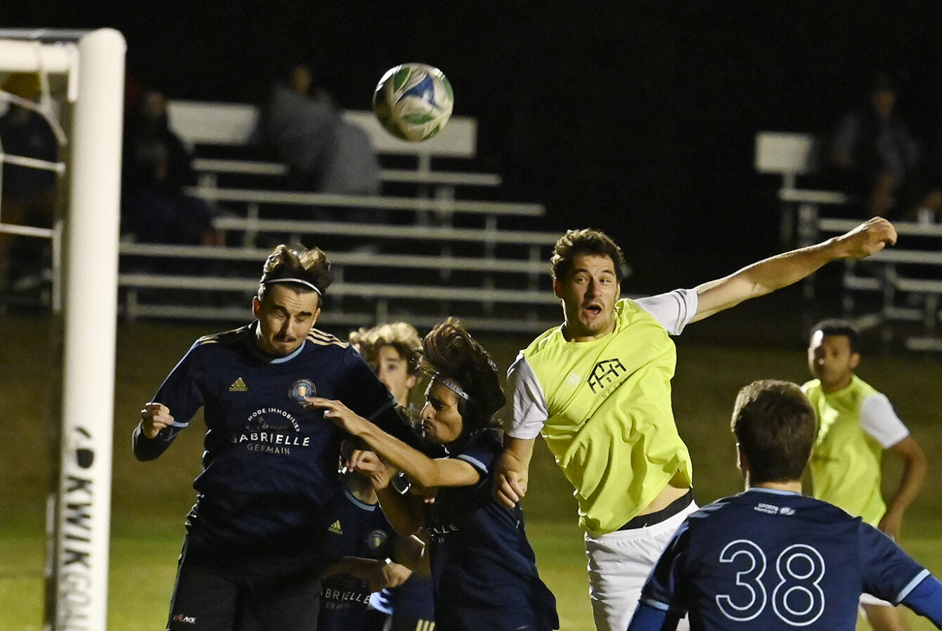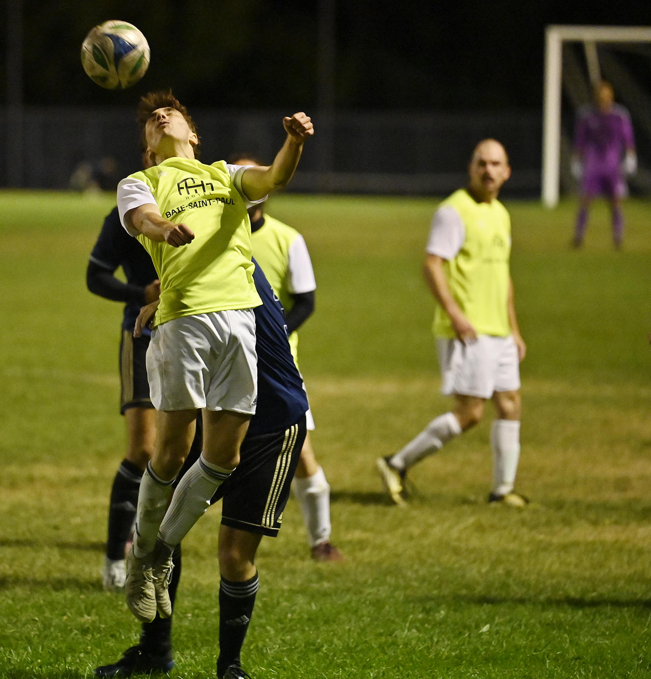 Le match a bien commencé pour l’équipe locale. Après quelques dizaines de minutes de jeu, El Mehdi Boumaiz a marqué un but spectaculaire de la tête sur un corner. Par la suite, les joueurs de Baie-Saint-Paul ont semblé dominer le terrain. Un premier « penalty » a été accordé à l’adversaire, mais le gardien de l’Hôtel Baie-Saint-Paul a été sauvé lorsque le ballon a frappé la barre transversale. Le malheur s’est ensuite abattu sur l’équipe : un carton rouge a été donné à un joueur de Baie-Saint-Paul, et une autre faute a mené à un second « penalty ». Cette fois, le CF L’INTERNATIONAL (JG)a inscrit un but, terminant la première mi-temps sur un score de 1-1.