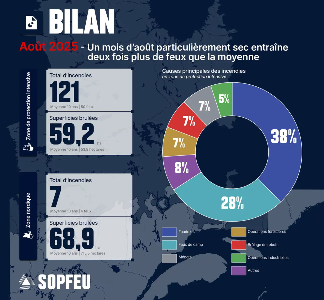Dans ce contexte, le passage rapide de plusieurs fronts de foudre a entraîné l’éclosion de 46 incendies, soit 38 % des feux recensés en août. Les activités humaines demeurent toutefois une cause importante : les feux de camp sont à l’origine de 34 incendies (28 % du total mensuel). Parmi les autres causes récurrentes, on retrouve les mégots de cigarette (7 %) ainsi que les brûlages de rebuts (7 %).