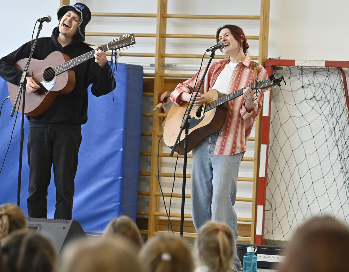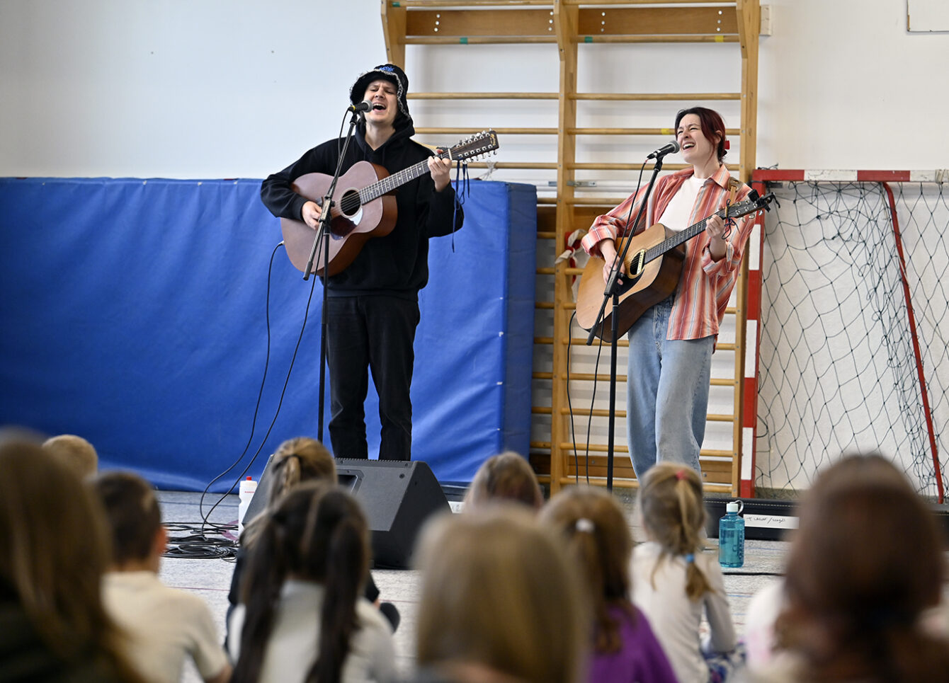 L'auteure-compositrice-interprète Lou-Adriane Cassidy, dans le cadre du programme « Festif! à l'École », accompagnée de son complice musical, Thierry Larose, lors de son passage à Saint-Hilarion en mars 2025. Photo d'archives : Jean-François Desgagnés/MPC