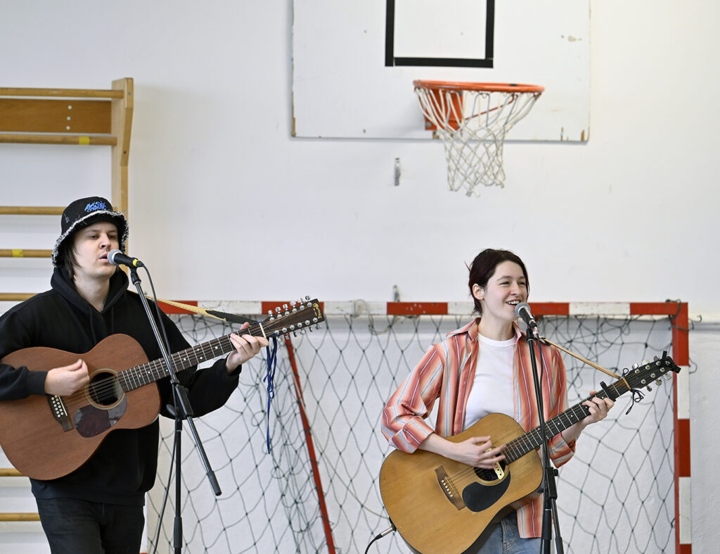 L'auteure-compositrice-interprète Lou-Adriane Cassidy, dans le cadre du programme « Festif! à l'École », accompagnée de son complice musical, Thierry Larose. Photo: Jean-François Desgagnés/MPC