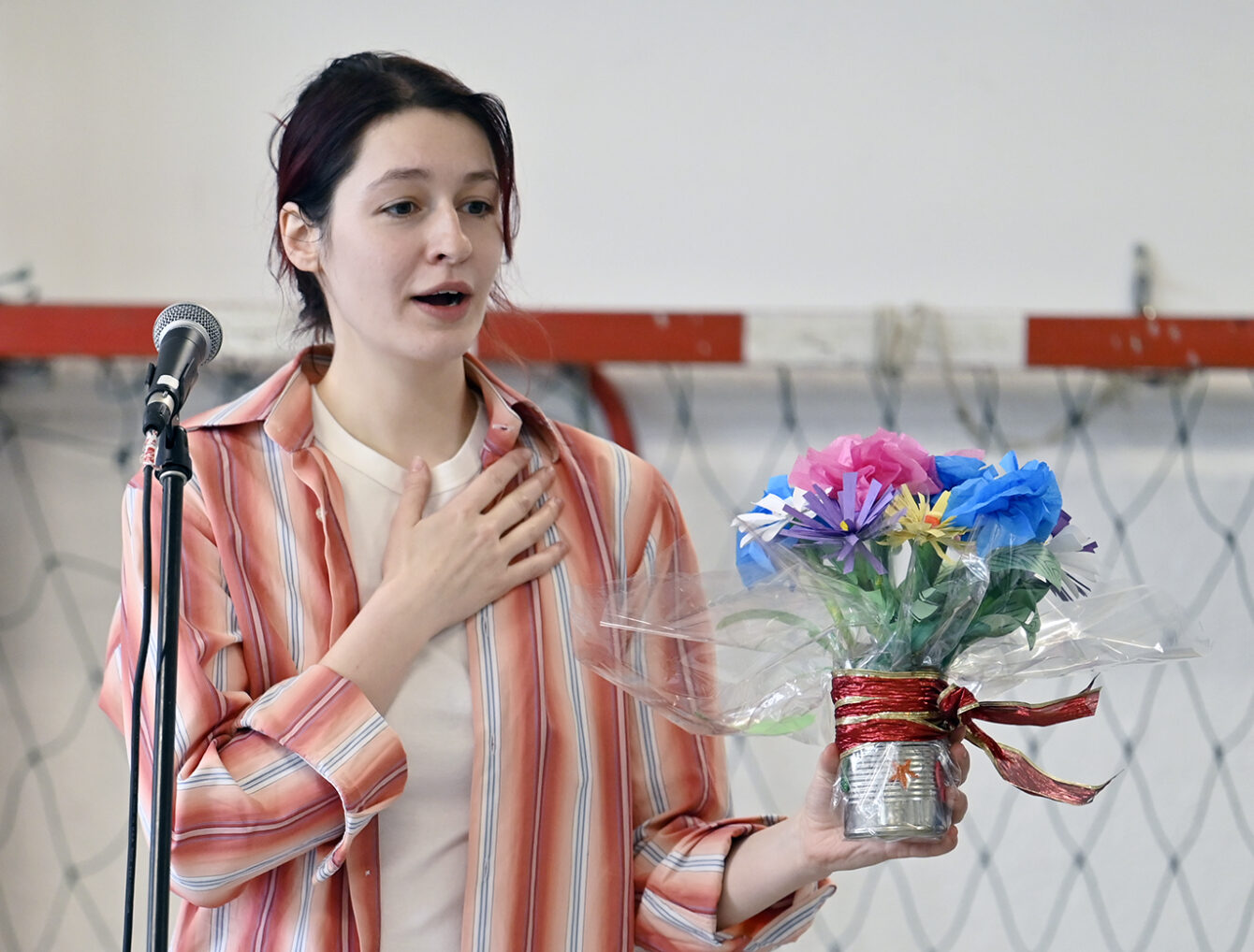 Une élève de maternelle a offert un bouquet de fleurs à Lou-Adriane Cassidy. Photo: Jean-François Desgagnés/MPC
