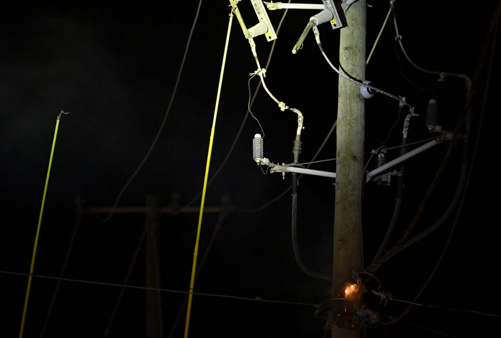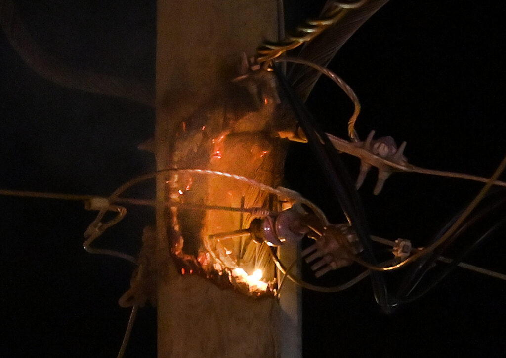 25 décembre 2024. Panne de courant d’une heure à Baie-Saint-Paul : un poteau électrique en feu en cause. Photo: Jean-François Desgagnés/MPC