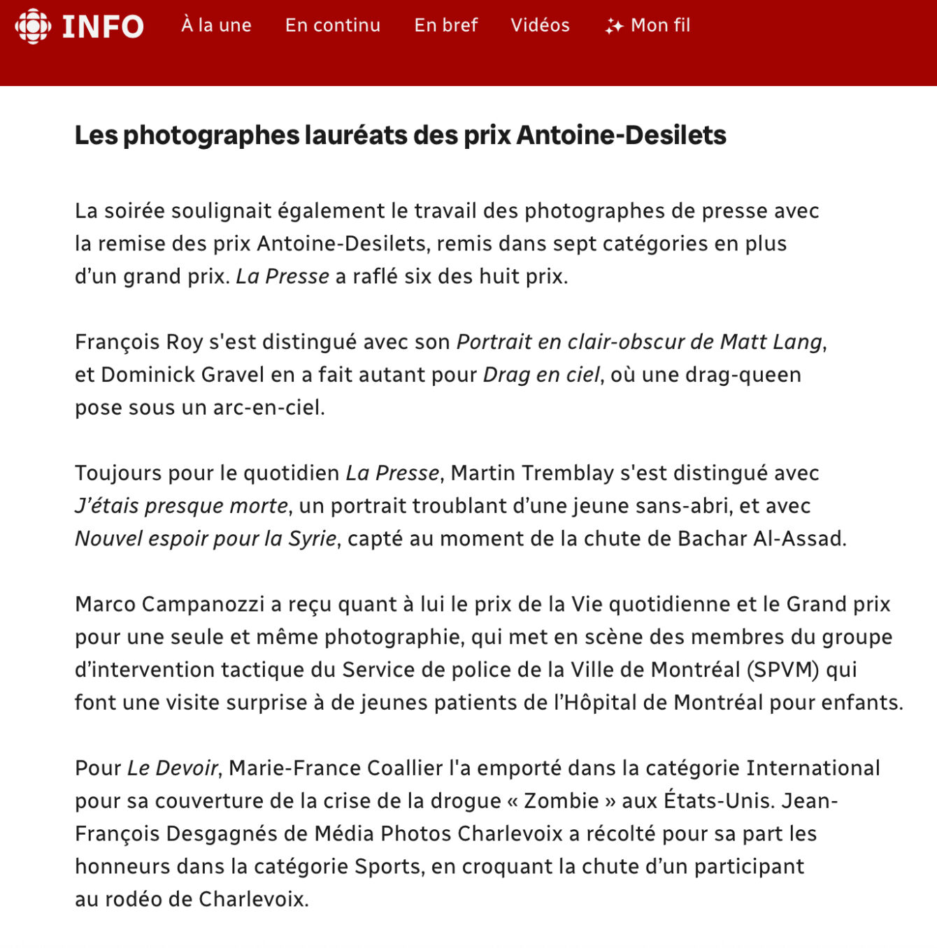 Le gala de remise de prix de la Fédération professionnelle des journalistes du Québec (FPJQ), qui se tenait le samedi 8 novembre à l’Hôtel Universel – Centre de congrès de Rivière-du-Loup, sous la coanimation d’Hugo Meunier, d’Urbania, et d’Annabelle Blais, du Journal de Montréal, célébrait l’excellence sur tous les fronts, les prix Antoine-Desilets 2024 (photojournalisme) et aussi les prix Judith-Jasmin (journalisme écrit). La soirée a non seulement récompensé les lauréat·e·s, mais elle a aussi été marquée par des commentaires et hommages vibrants de la part de collègues et d’intervenants concernant le décès récent d’Olivier Jean, photographe de presse respecté de La Presse.